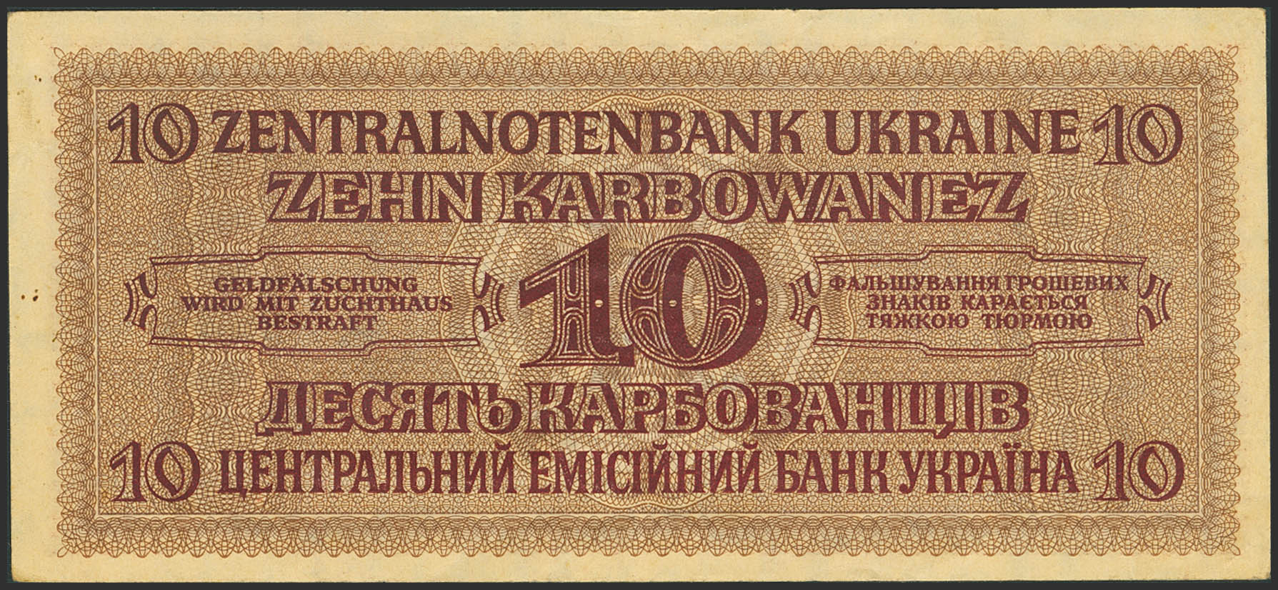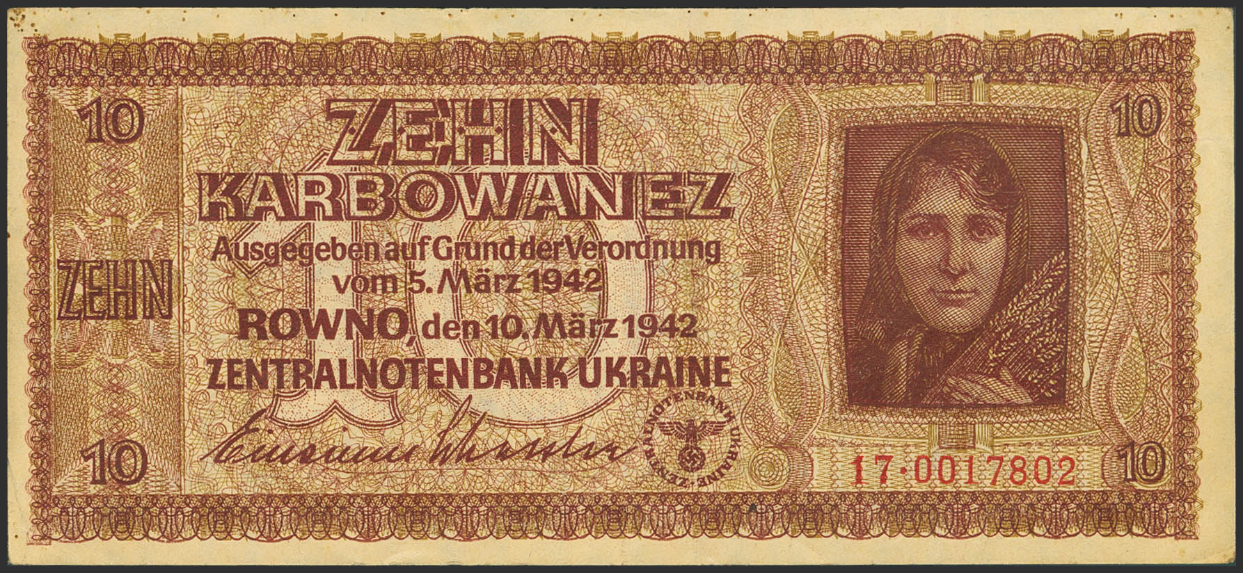 UKRAINE. 10 Karbowanez. March 10, 1942. Central Note Bank. (Pick: 52). Extremely Fine.