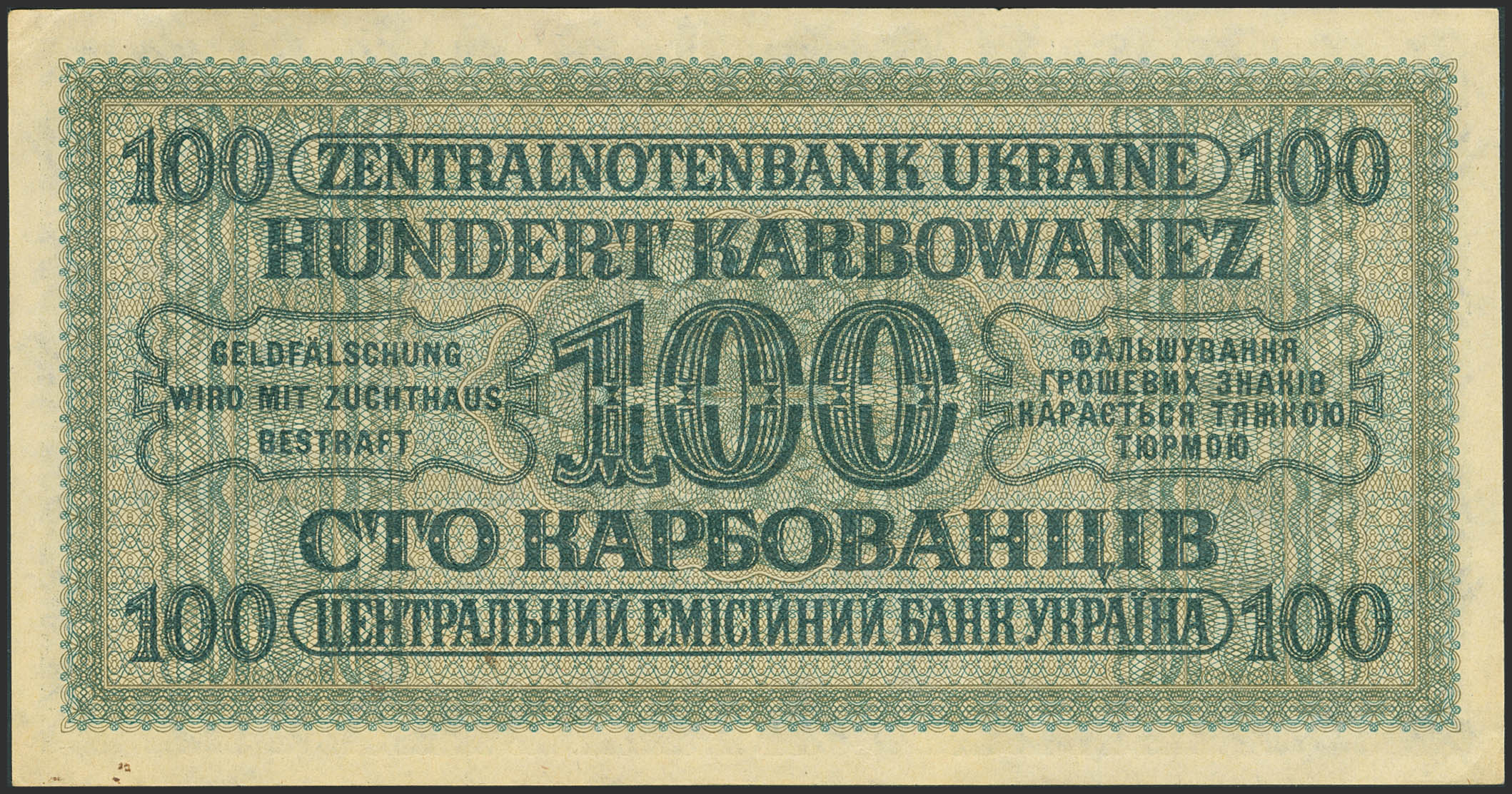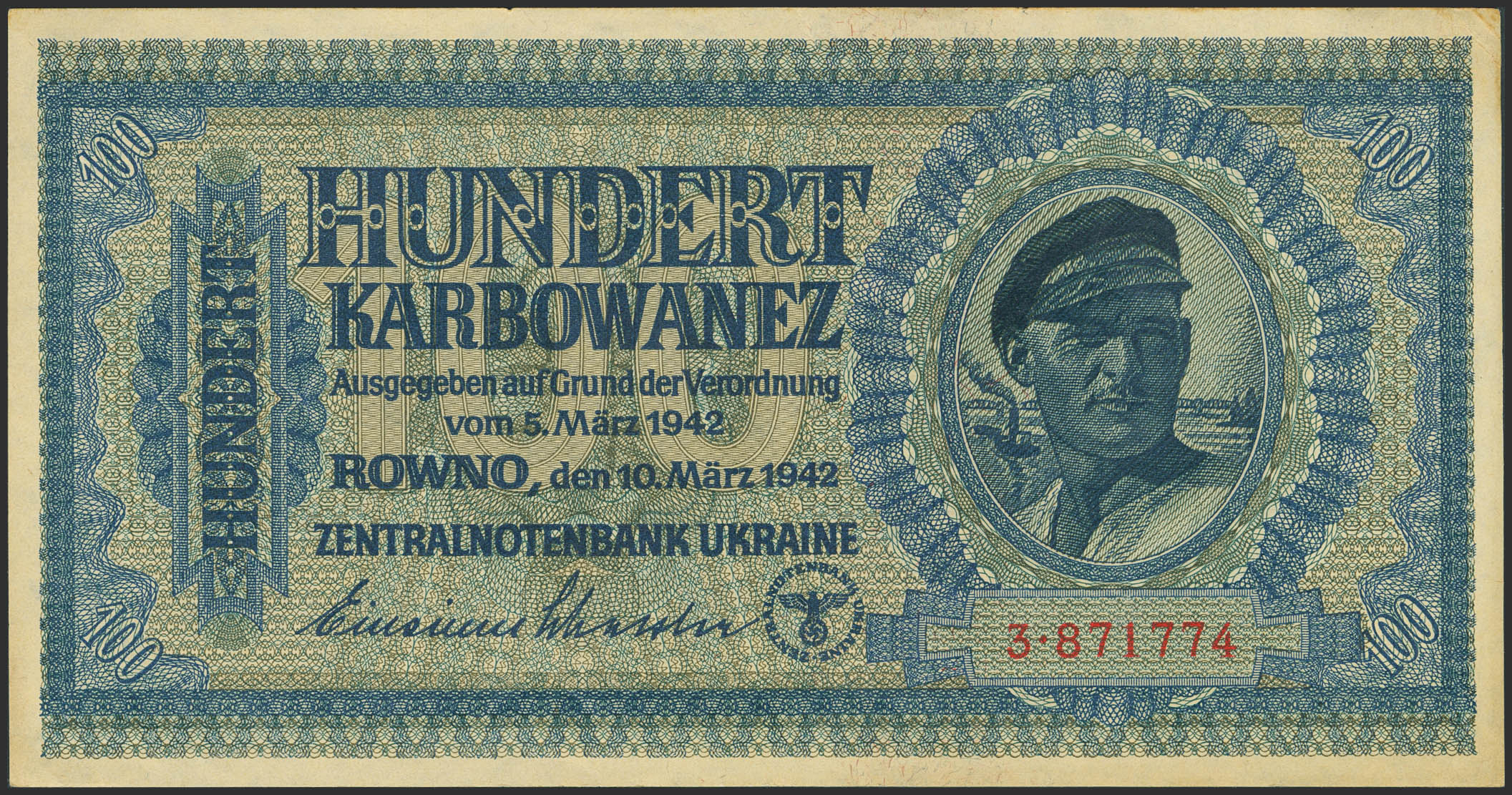UKRAINE. 100 Karbowanez. March 10, 1942. Central Note Bank. (Pick: 55). Almost Uncirculated.