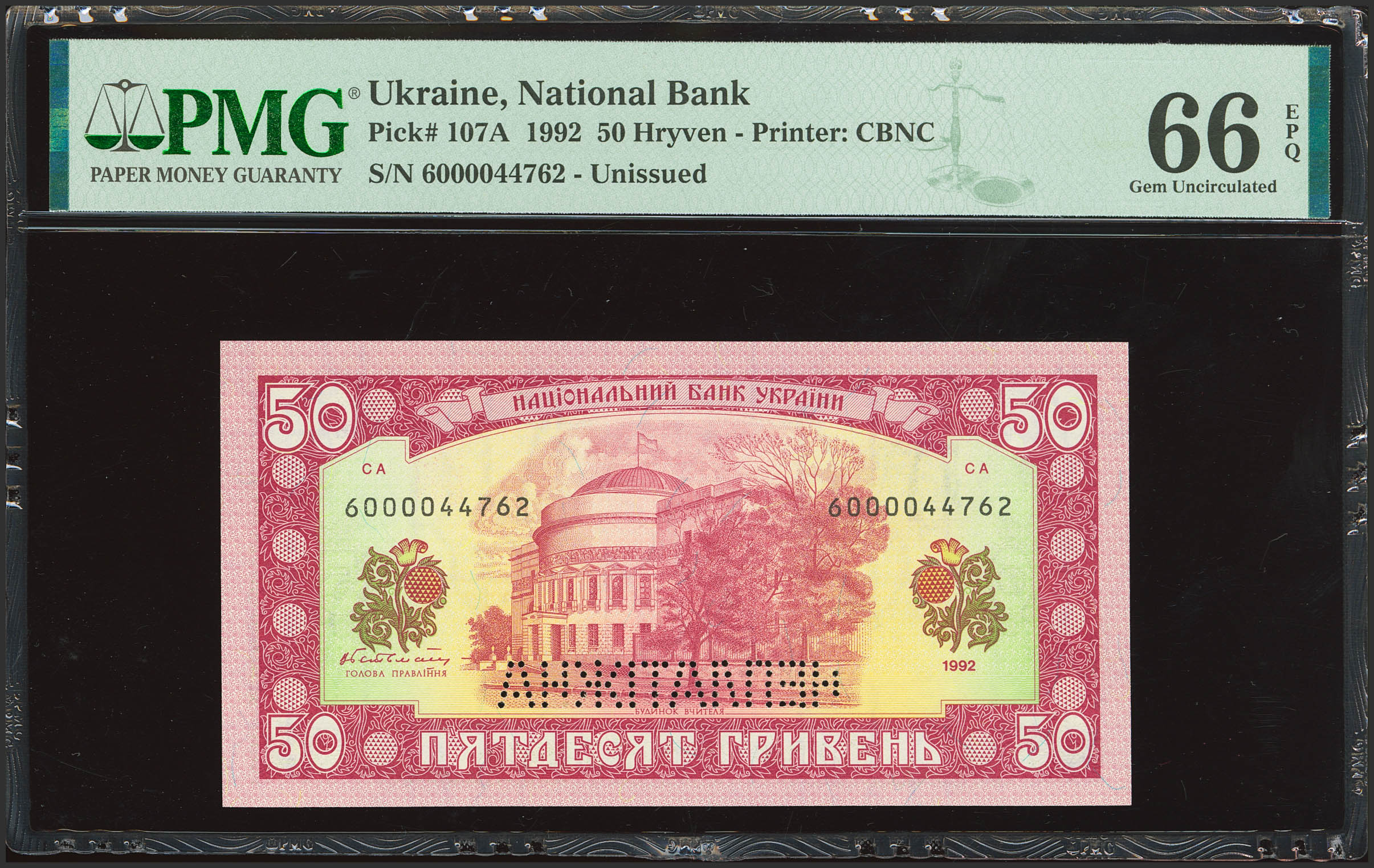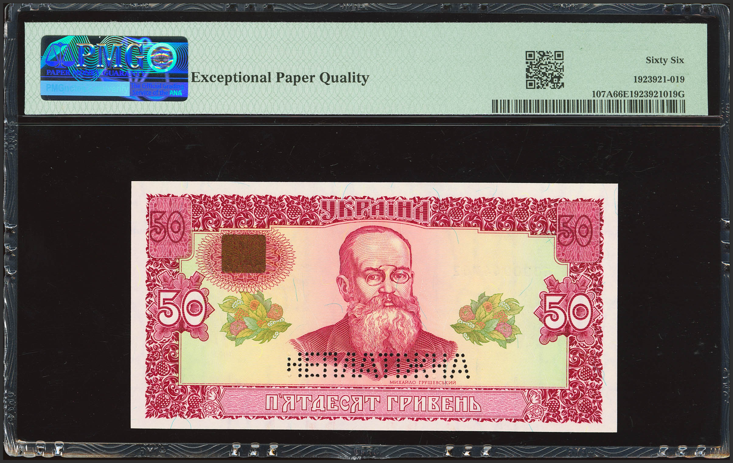 UKRAINE. 50 Hriven. 1992. National Bank, perforated. Specimen. (Pick: 107A). PMG66EPQ.
