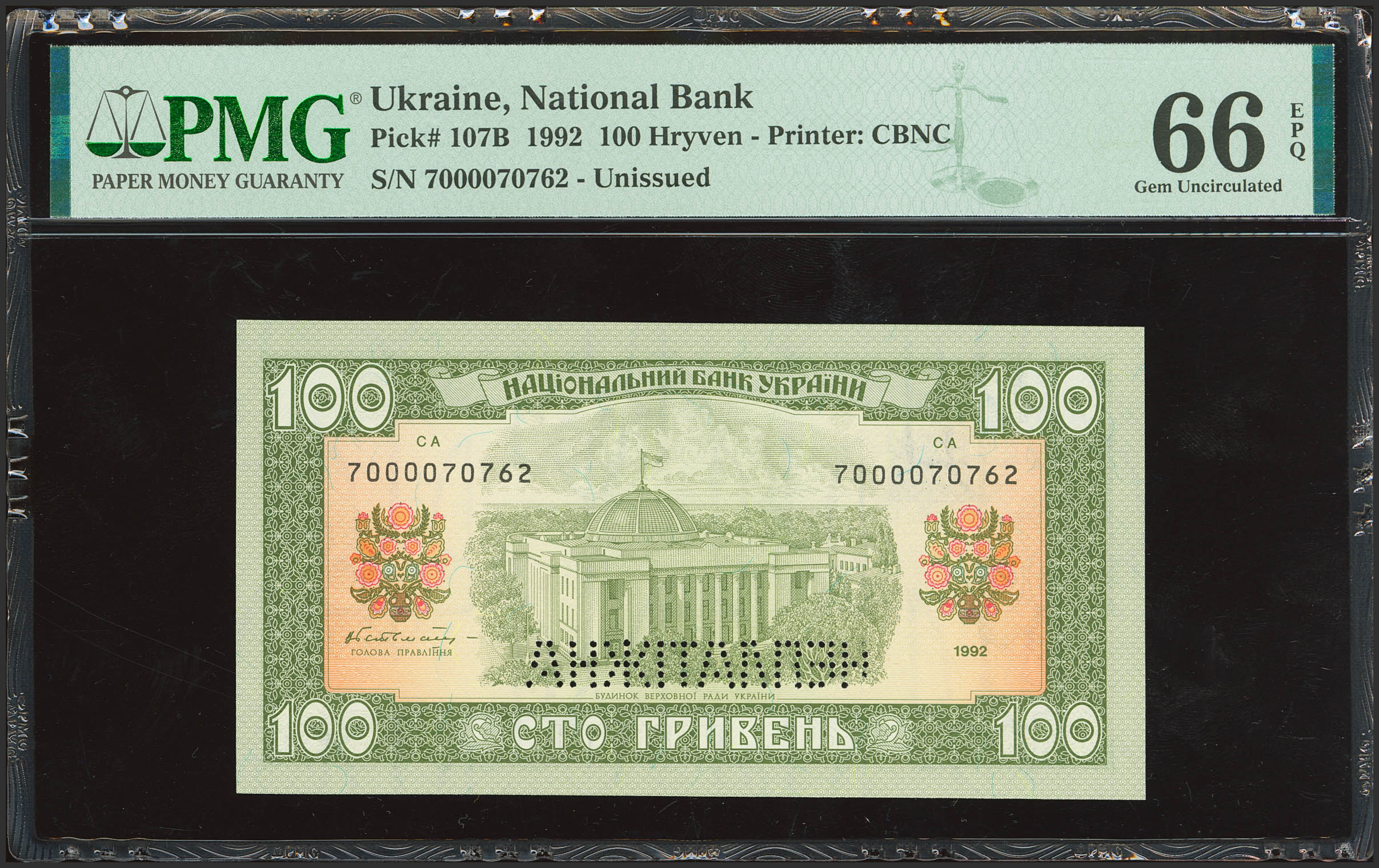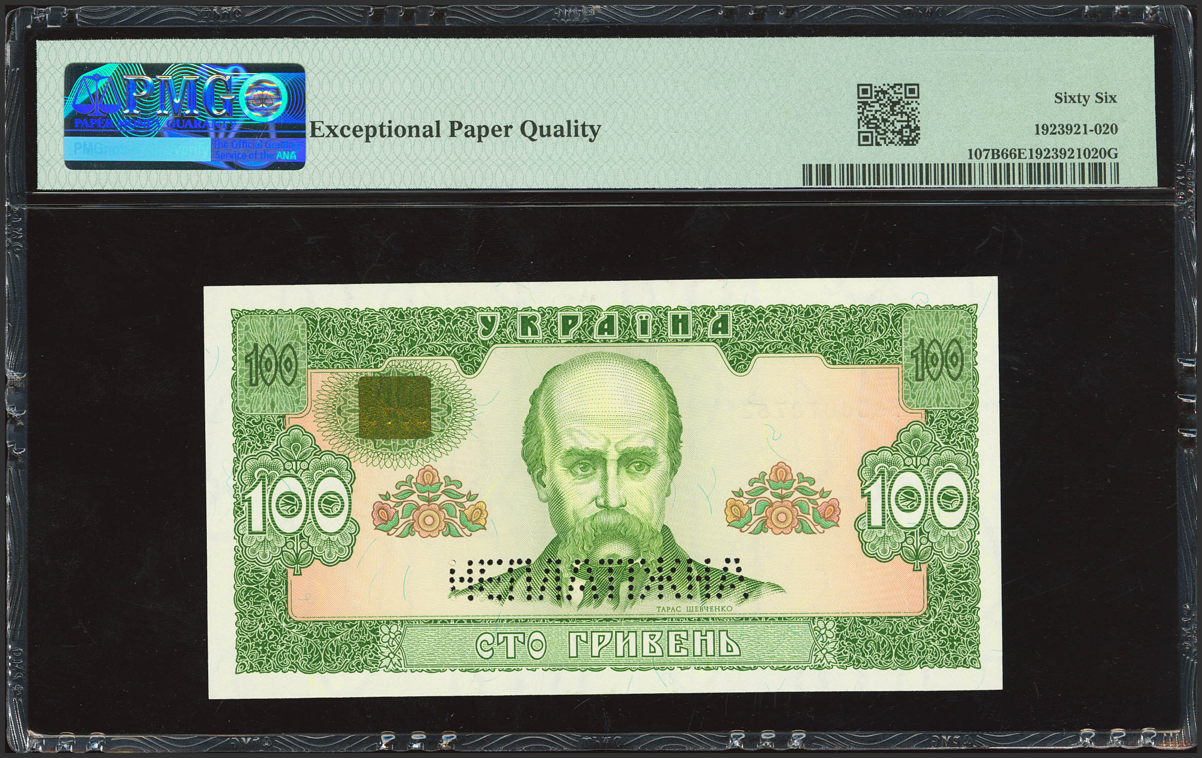 UKRAINE. 100 Hriven. 1992. National Bank, perforated. Specimen. (Pick: 107B). PMG66EPQ.