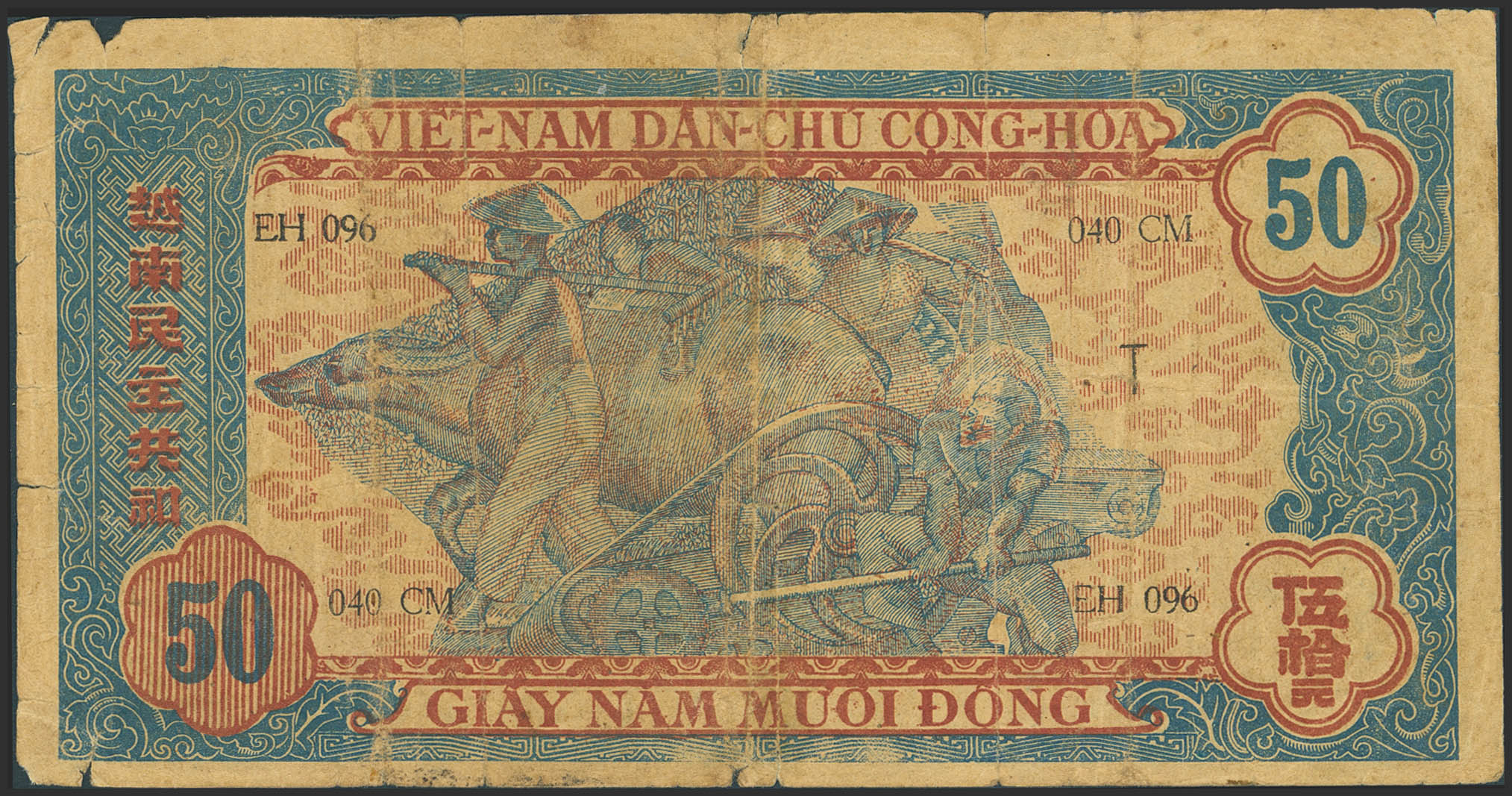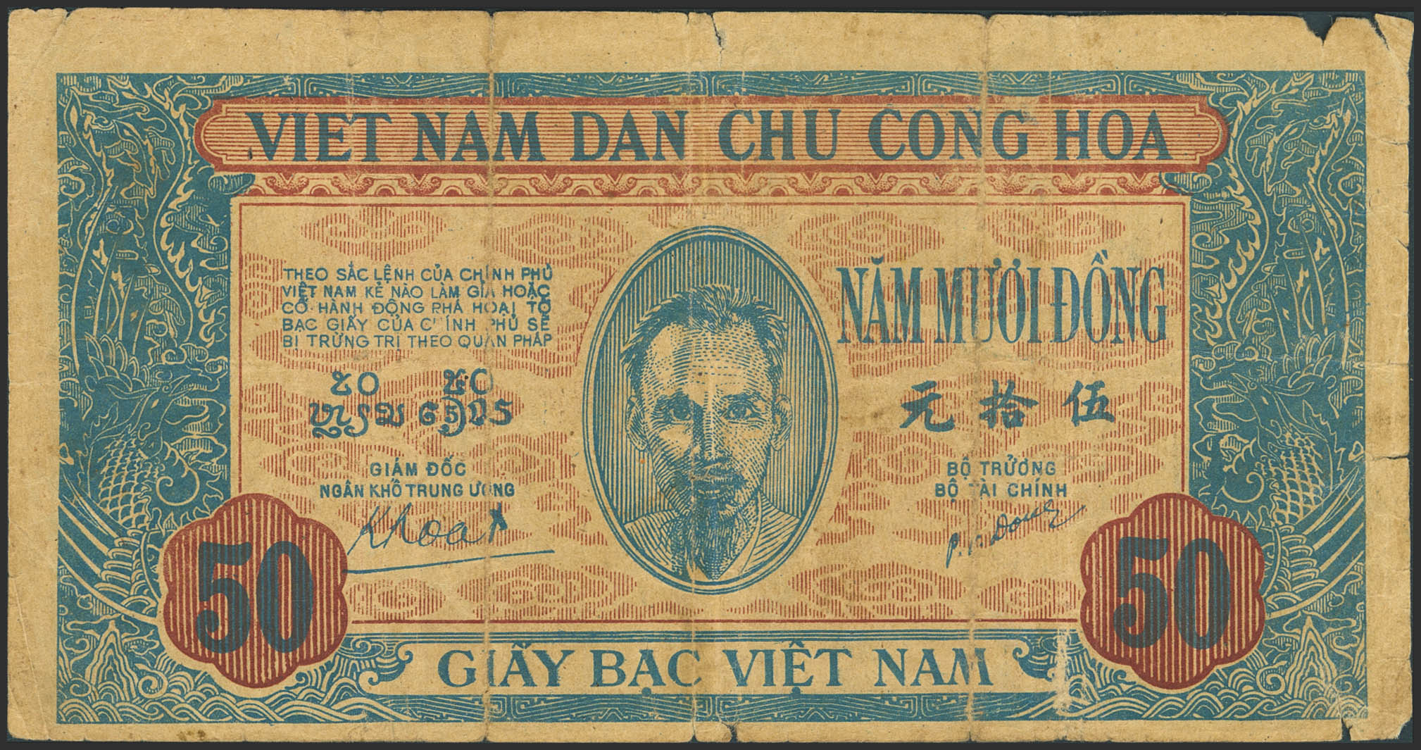 VIETNAM. 50 Dong. (1947ca). Democratic Republic of Vietnam. Watermark VNDCCH. (Pick: 11b). Fine, nicks, tears, pinholes.