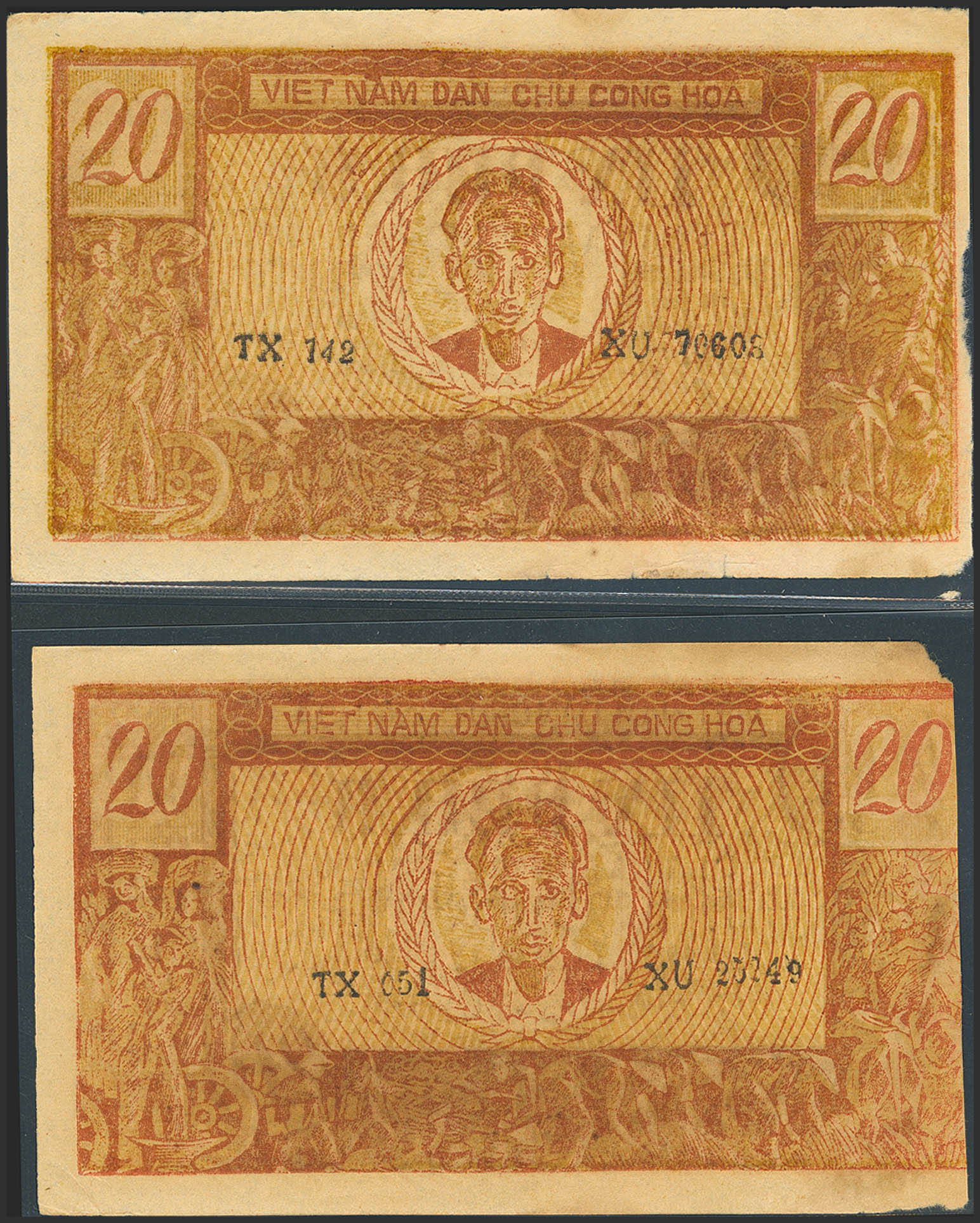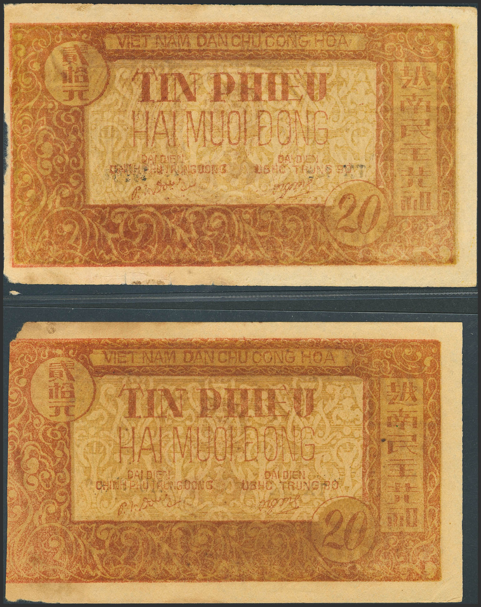 VIETNAM. Lot of 2 notes of 20 Dong. (1948ca). Democratic Republic of Vietnam. Credit Notes. (Pick: 49a). More than Extremely Fine, one with tears, another with the right margin trimmed.