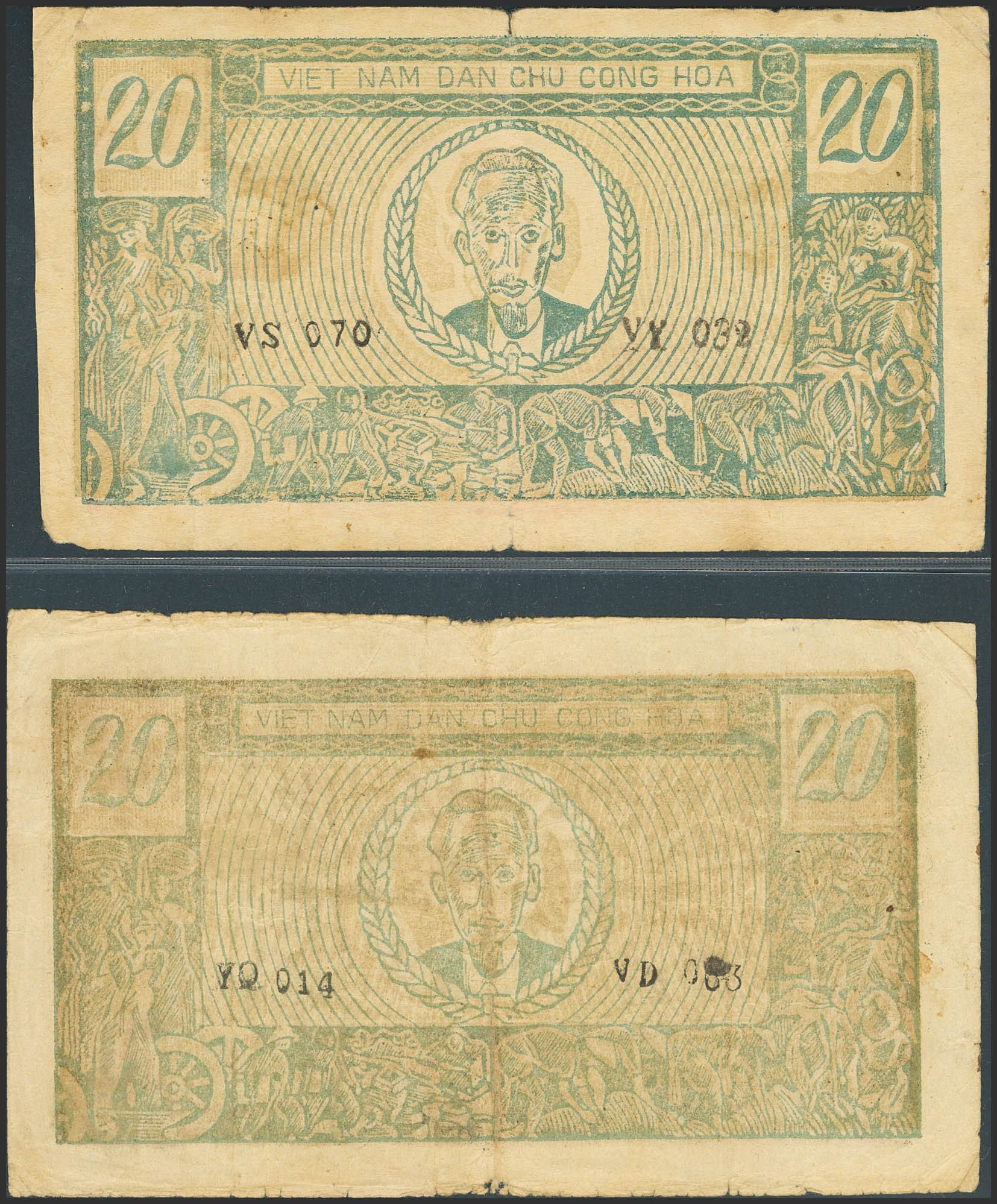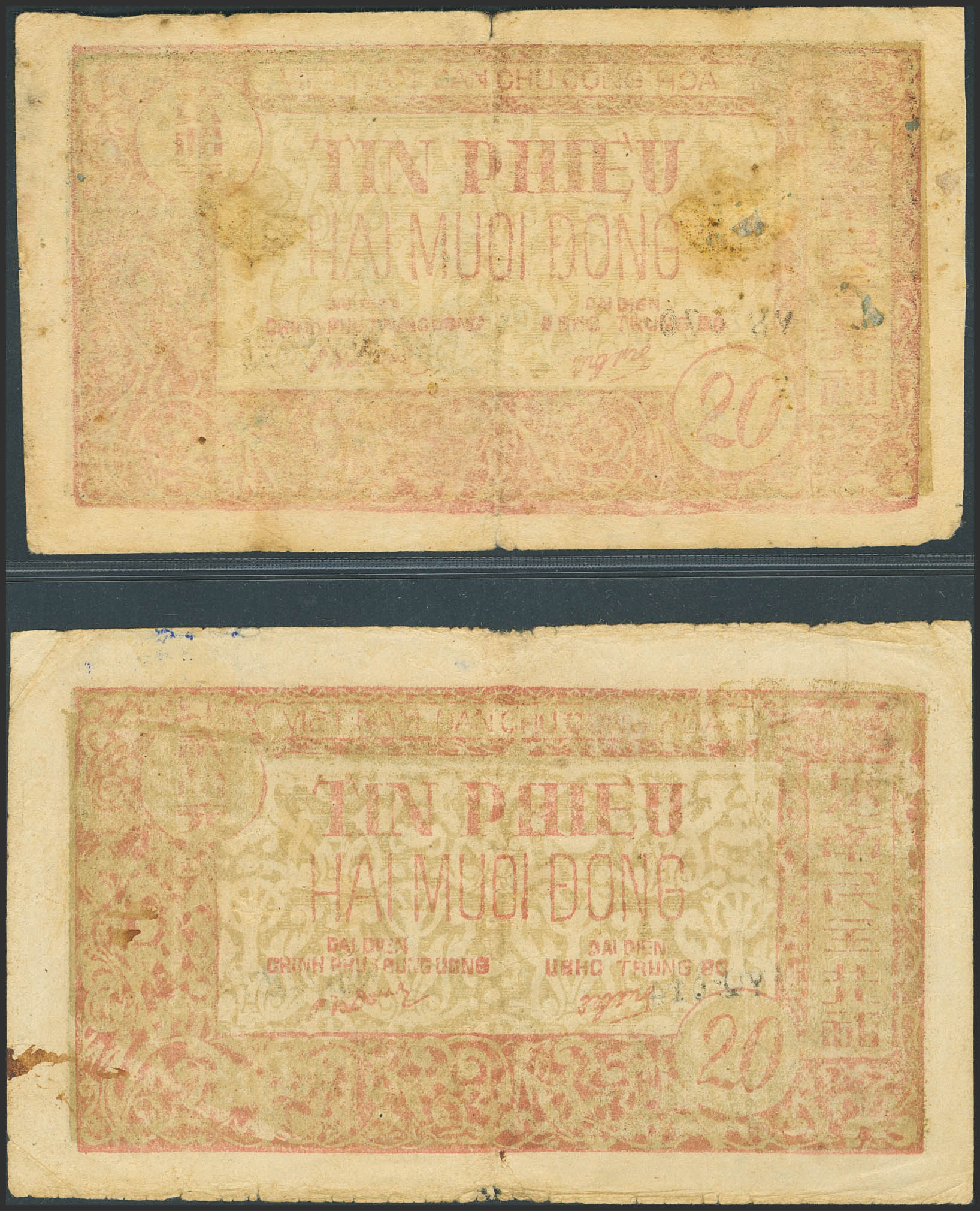 VIETNAM. Lot of 2 notes of 20 Dong. (1948ca). Democratic Republic of Vietnam. Credit Notes. (Pick: 49a). Fine.