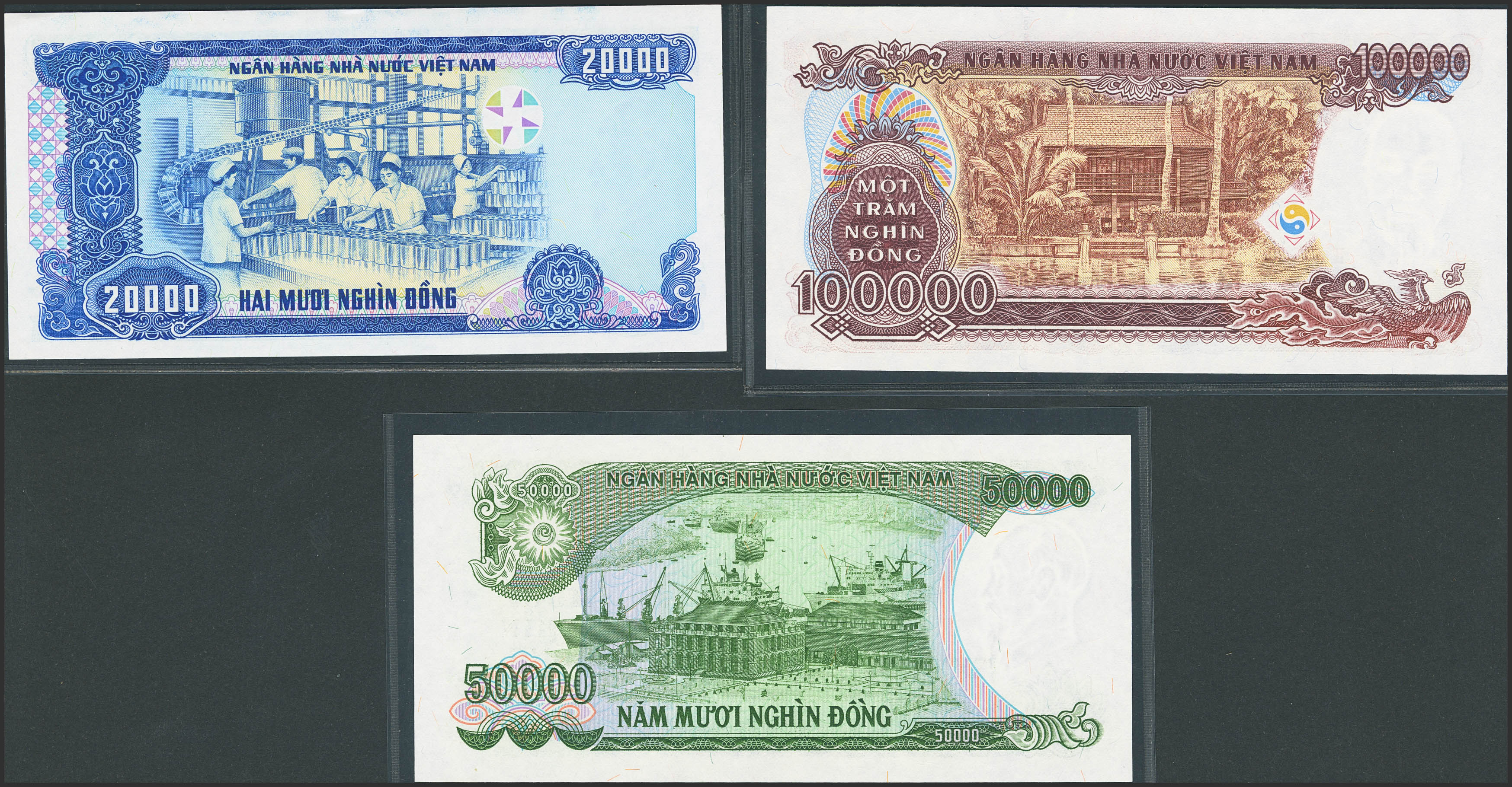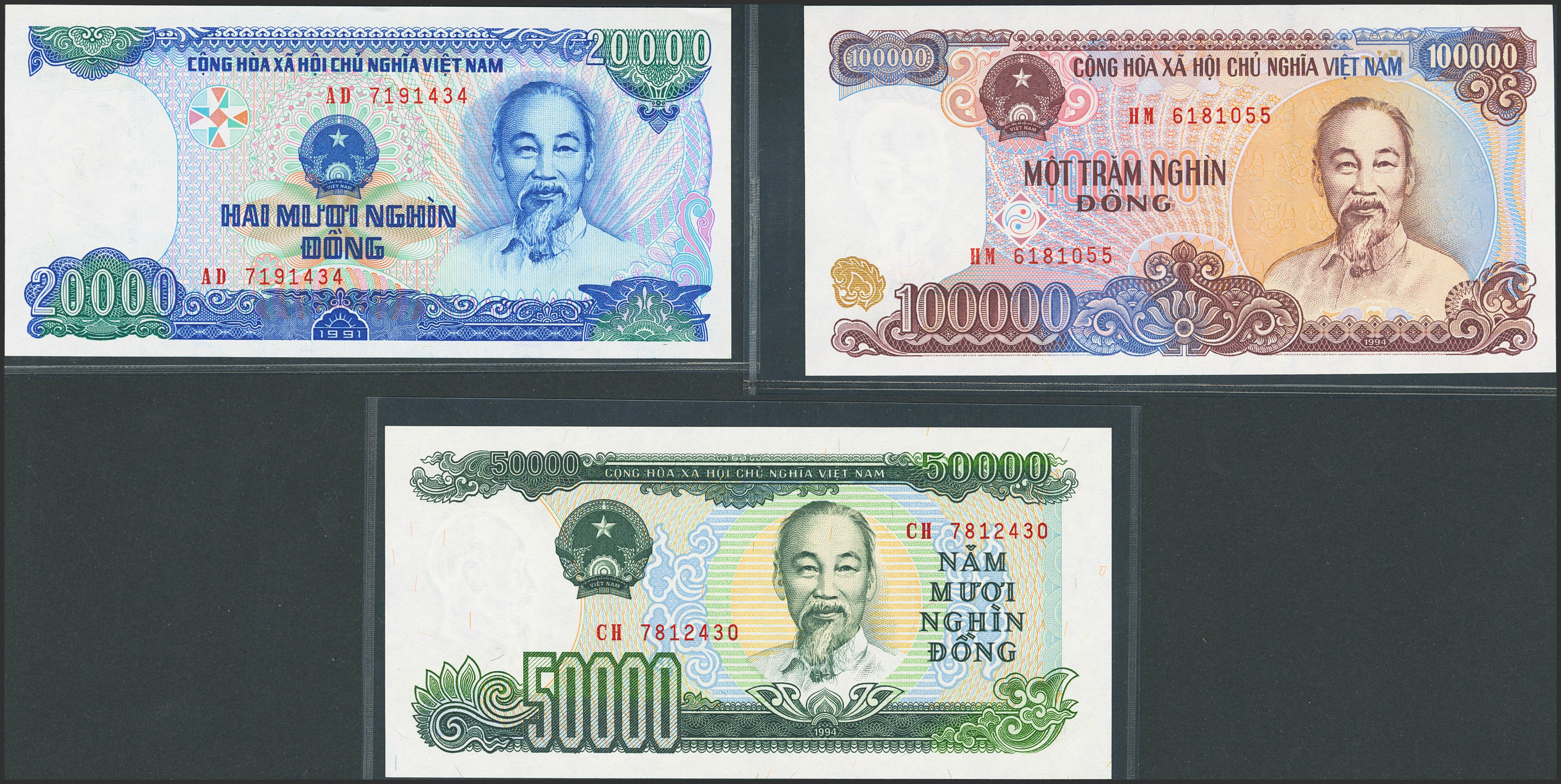 VIETNAM. Lot of 3 notes from 20000-100000 Dong. 1991, 1994. State Bank. (Pick: 110a, 116a, 117a). Uncirculated.
