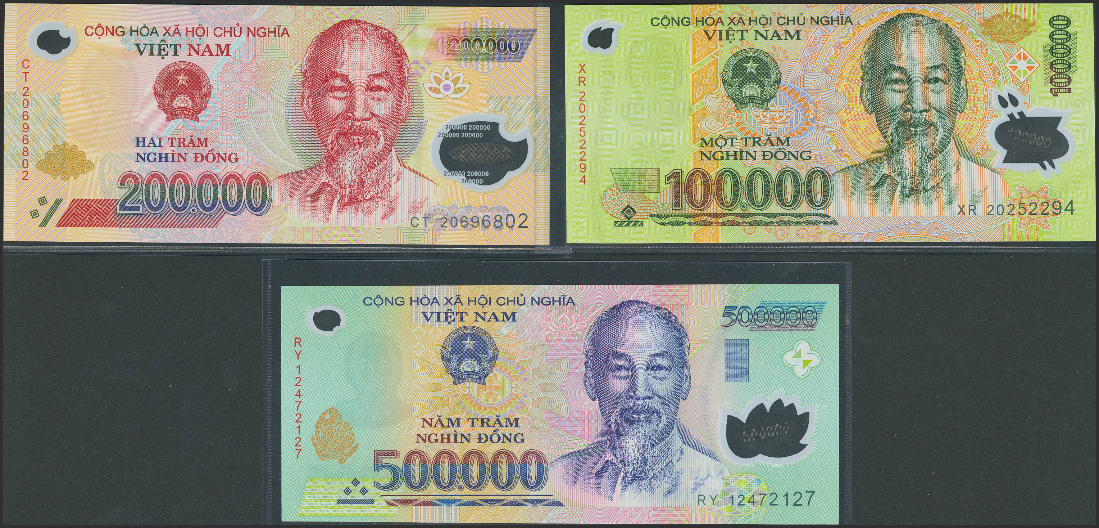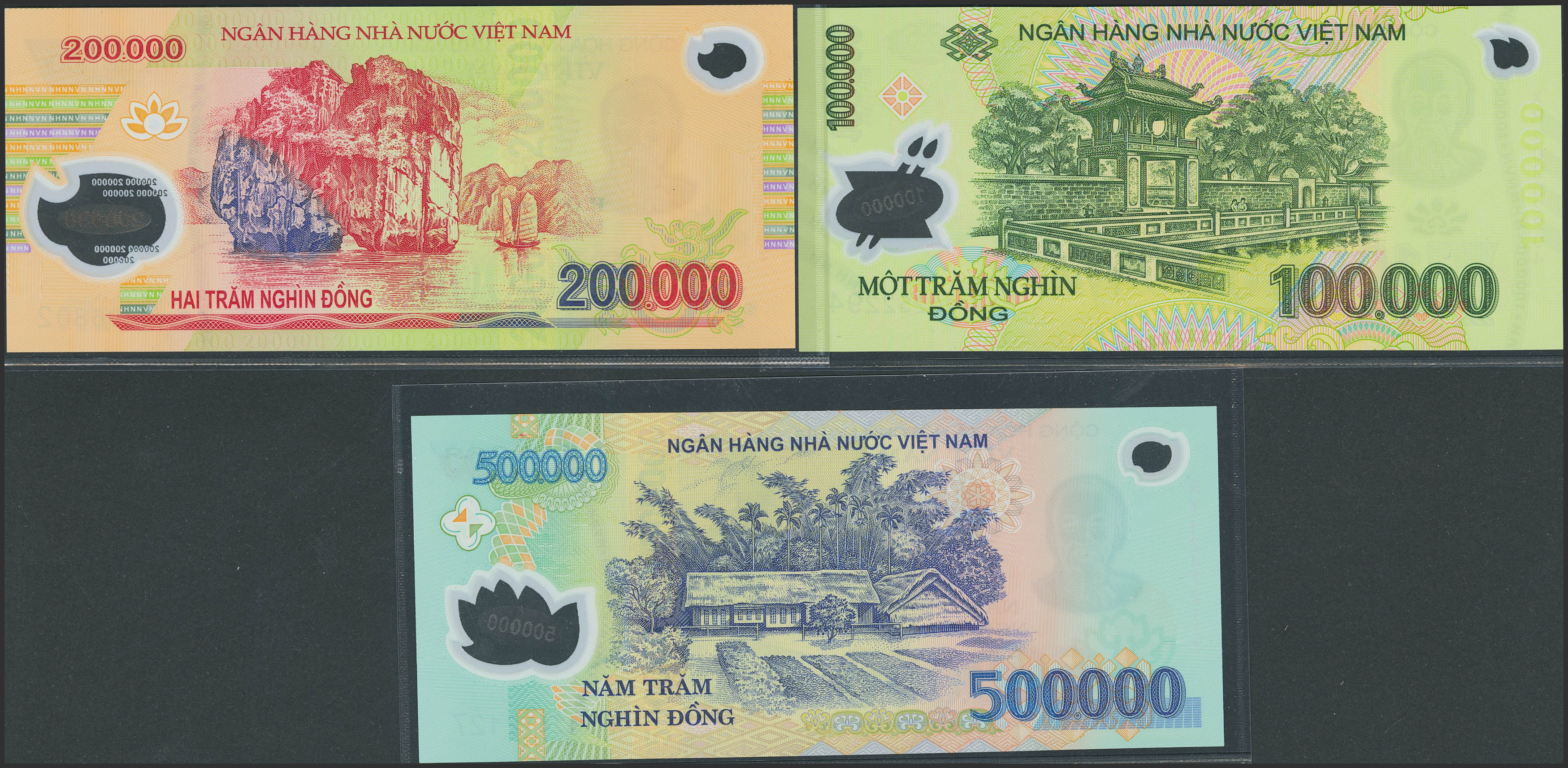 VIETNAM. Lot of 3 notes from 100000-500000 Dong. 2012, 2020. State Bank. (Pick: 122q, 123k, 124i). Uncirculated.