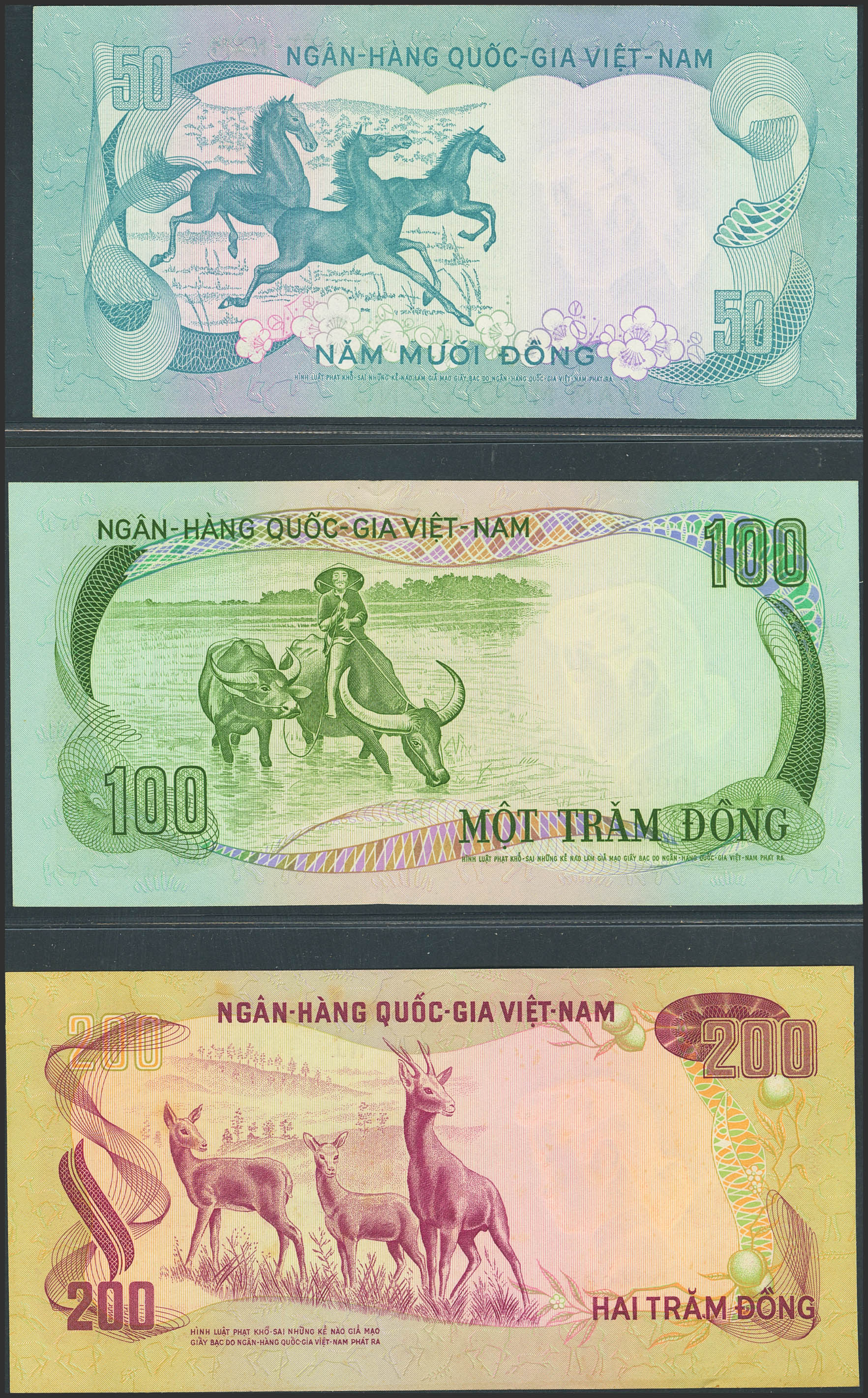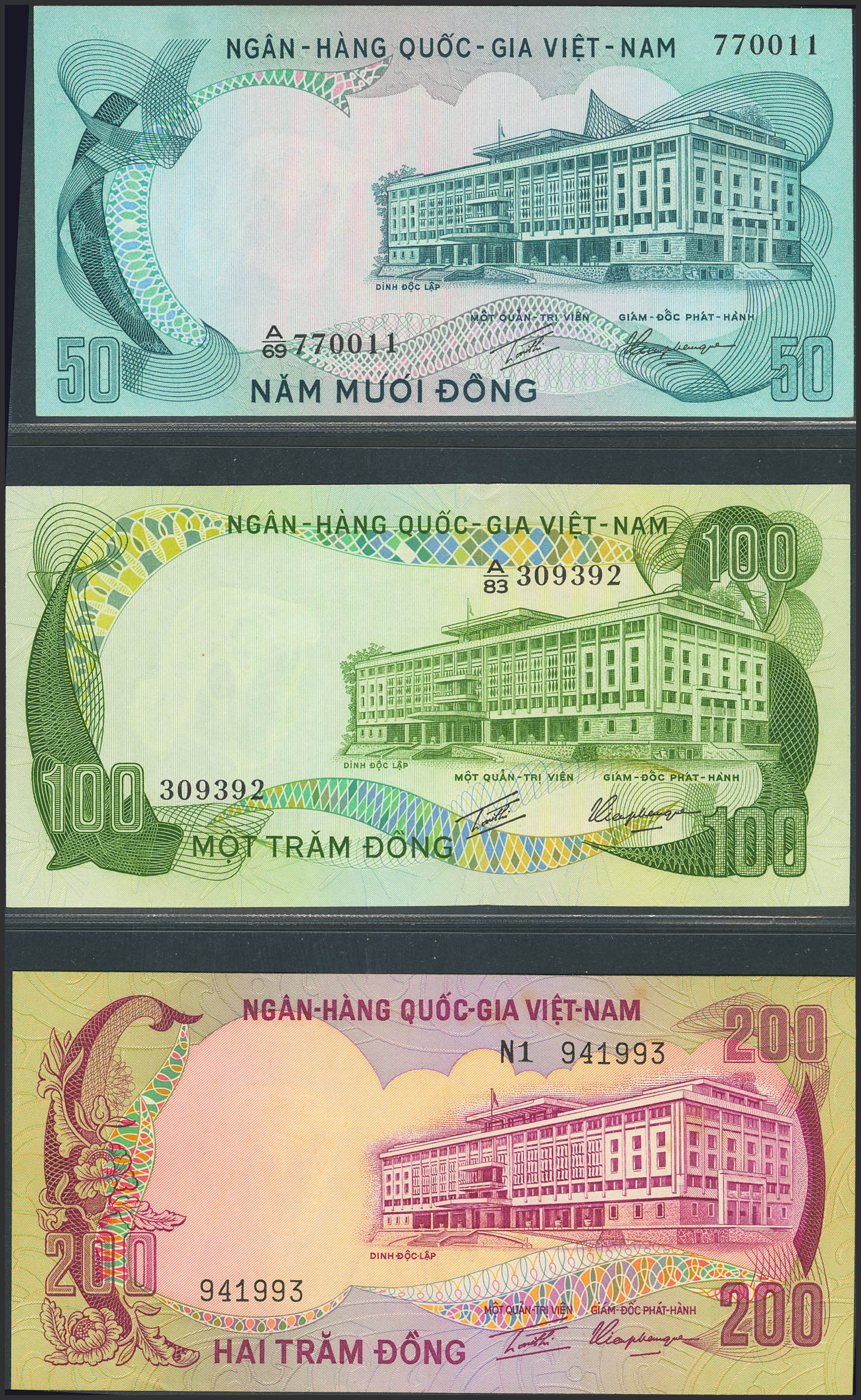 VIETNAM SOUTH. Lot of 3 notes from 50 to 200 Dong. (1972ca). National Bank. (Pick: 30a, 31a, 32a). Uncirculated.