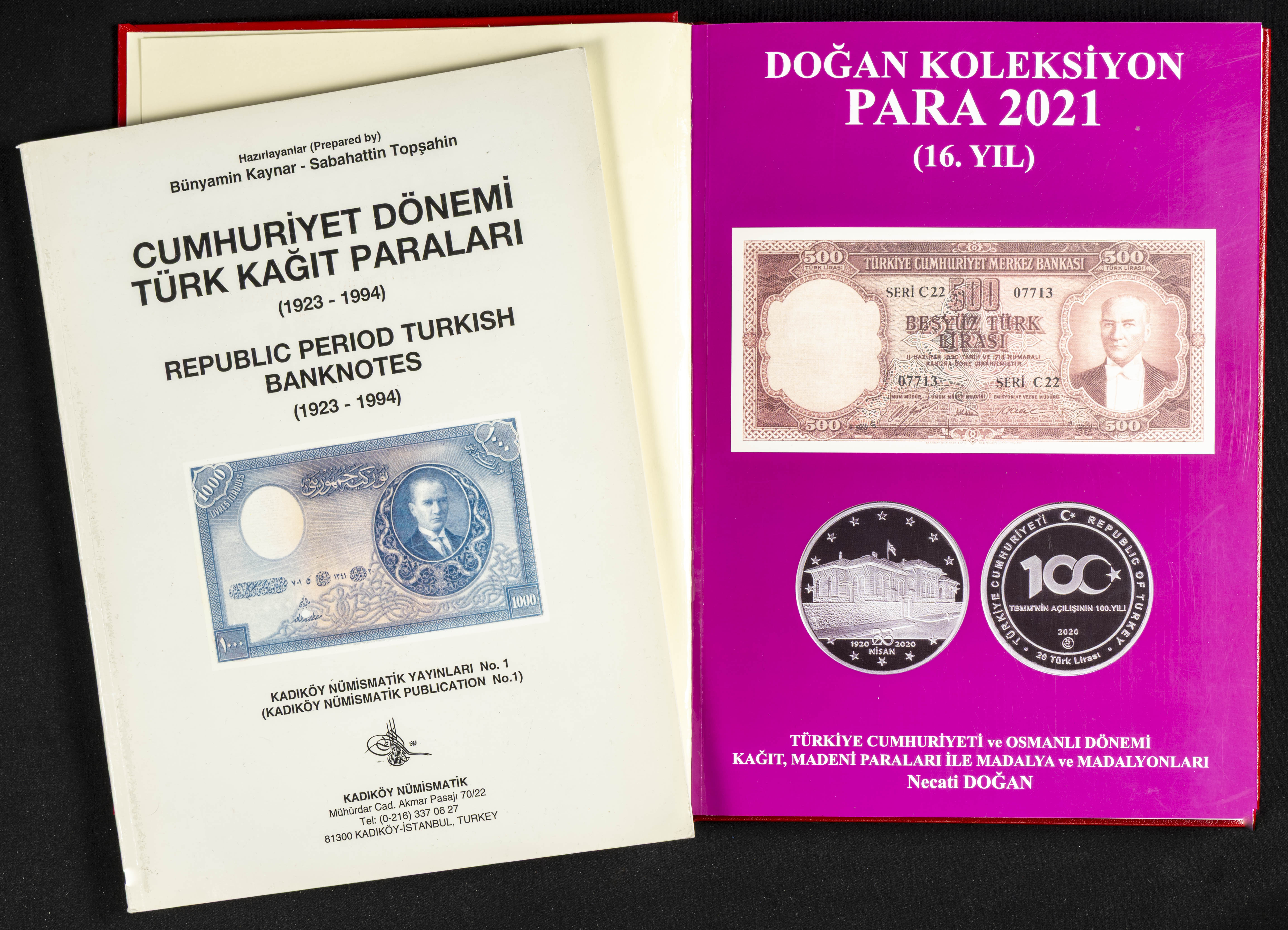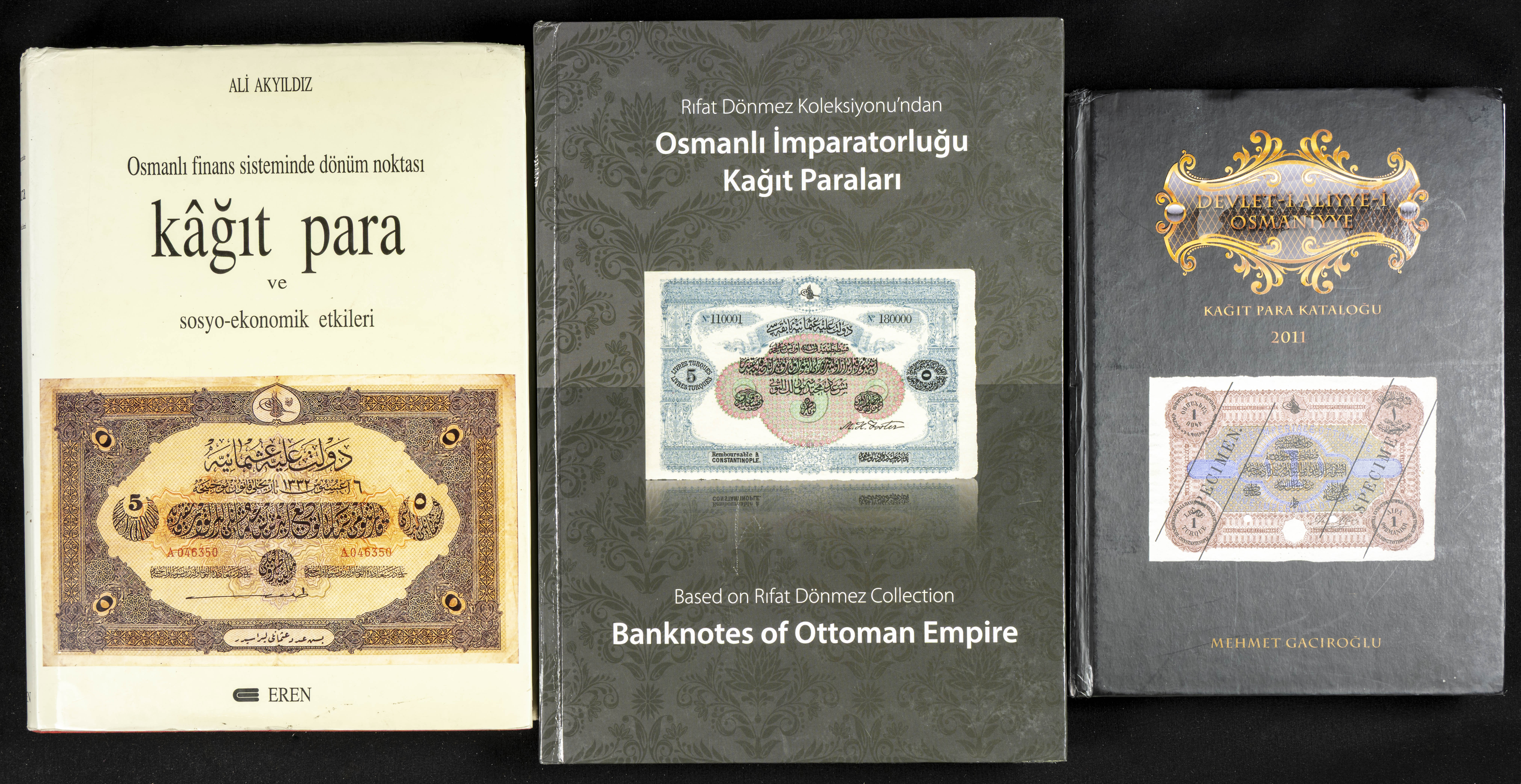 Set of 5 different items (4 catalogs + 1 reference book) related to the history of paper money in Turkey (Ottoman Empire and Republic). Includes very rare and hard-to-find works. Generally in good overall condition. TO EXAM.