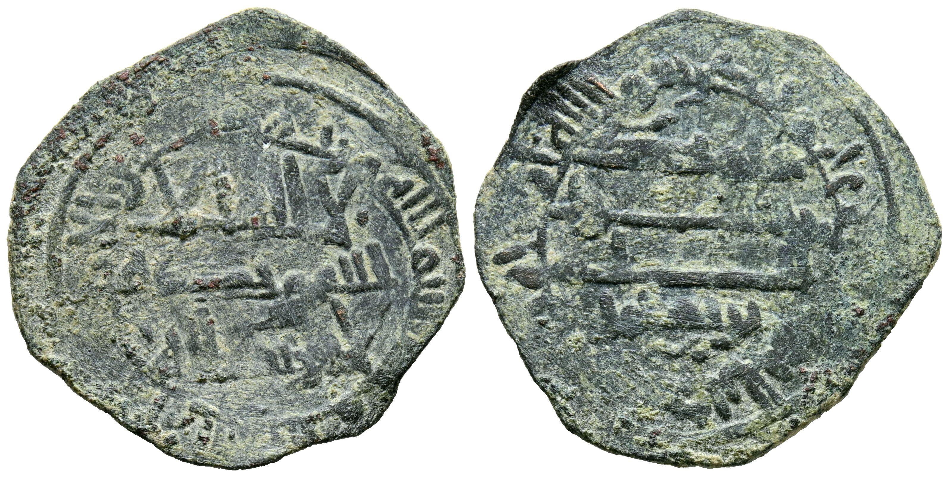 INDEPENDENT EMIRATE OF CORDOBA. Abd al-Rahman III. Felús. (Ae. 1.55g/22mm). 303H. al-Ándalus /الاندلس. (Vives 334; Miles 183; Frochoso I-77). Quoting Ibn Bahlul / بن بهلول below in IIA. VF+. Very interesting and rare specimen that preserves, legibly, practically all of its legends.