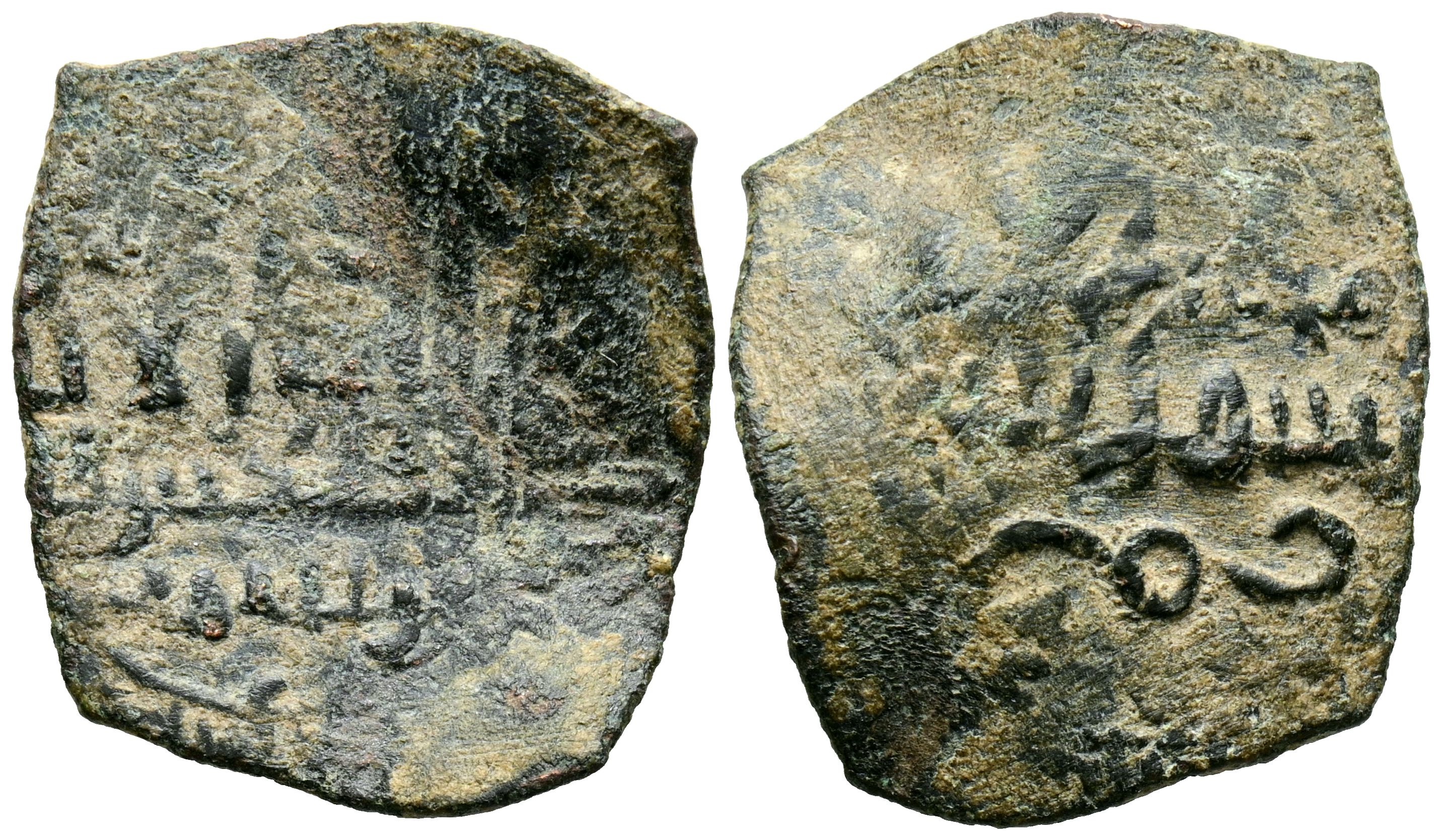 CALIPHATE OF CORDOBA. Abd al-Rahman III. Felus. (Ae. 2.23g/23mm). 319-323H. (Vives 370; Frochoso I-92; Frochoso, Francés and Rodríguez (Manquso 19/2024) Type 39). Quoting Abd al-Rahman with title Amir al-Muminin: امير المومنين / عبد الرحمن in IA. and Yahya Ibn Yunus / يحيى عبده in IIA. Very Fine-. Warped Queer.