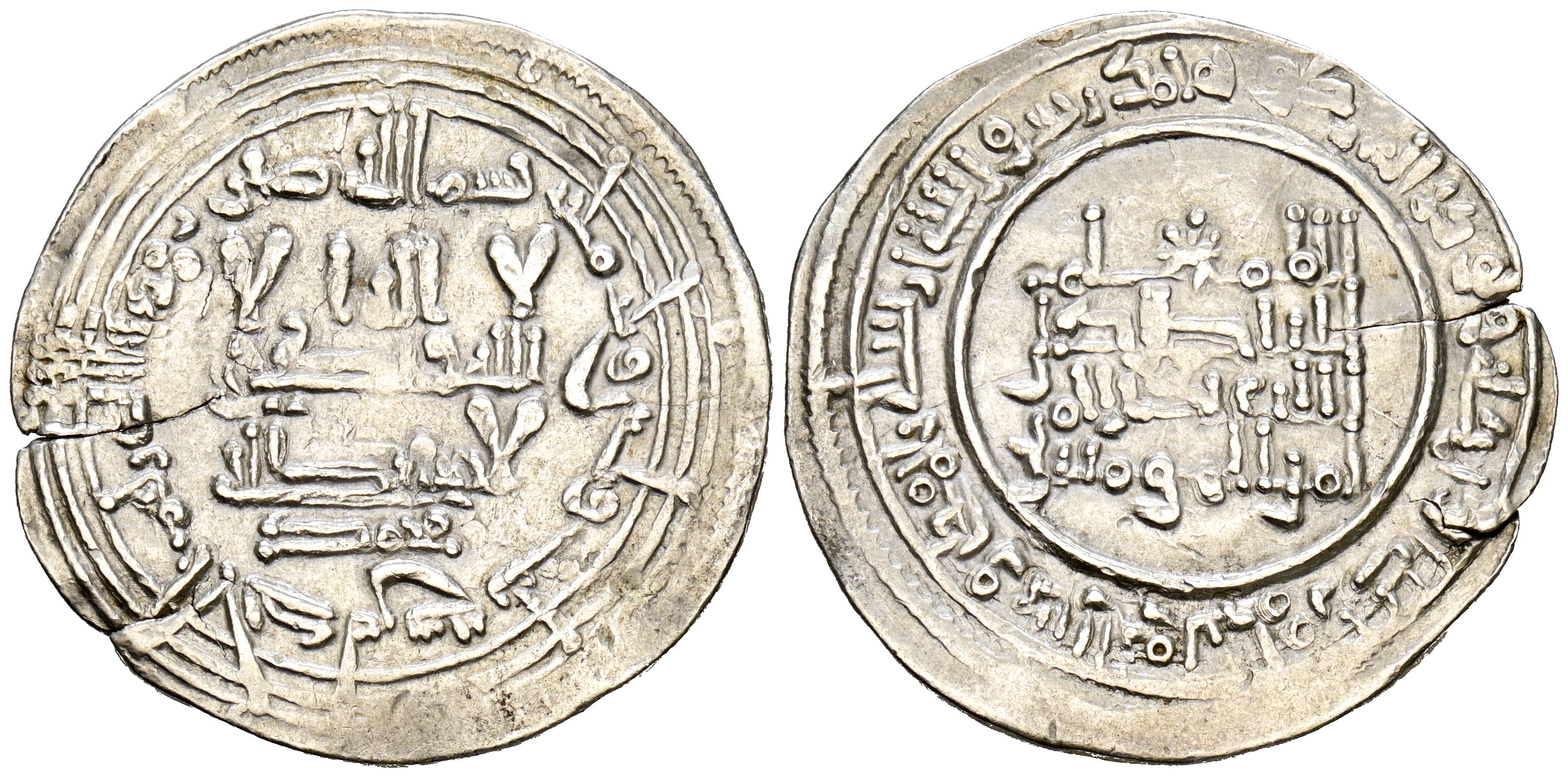 CALIPHATE OF CÓRDOBA. 'Abd al-Rahman III. Dirham. (Ar. 3.81g/26mm). 333H. al-Andalus / الاندلس. (Vives 404; Frochoso 333.10). Quoting Mohammad/محمد in IA. Very Fine. Crack.