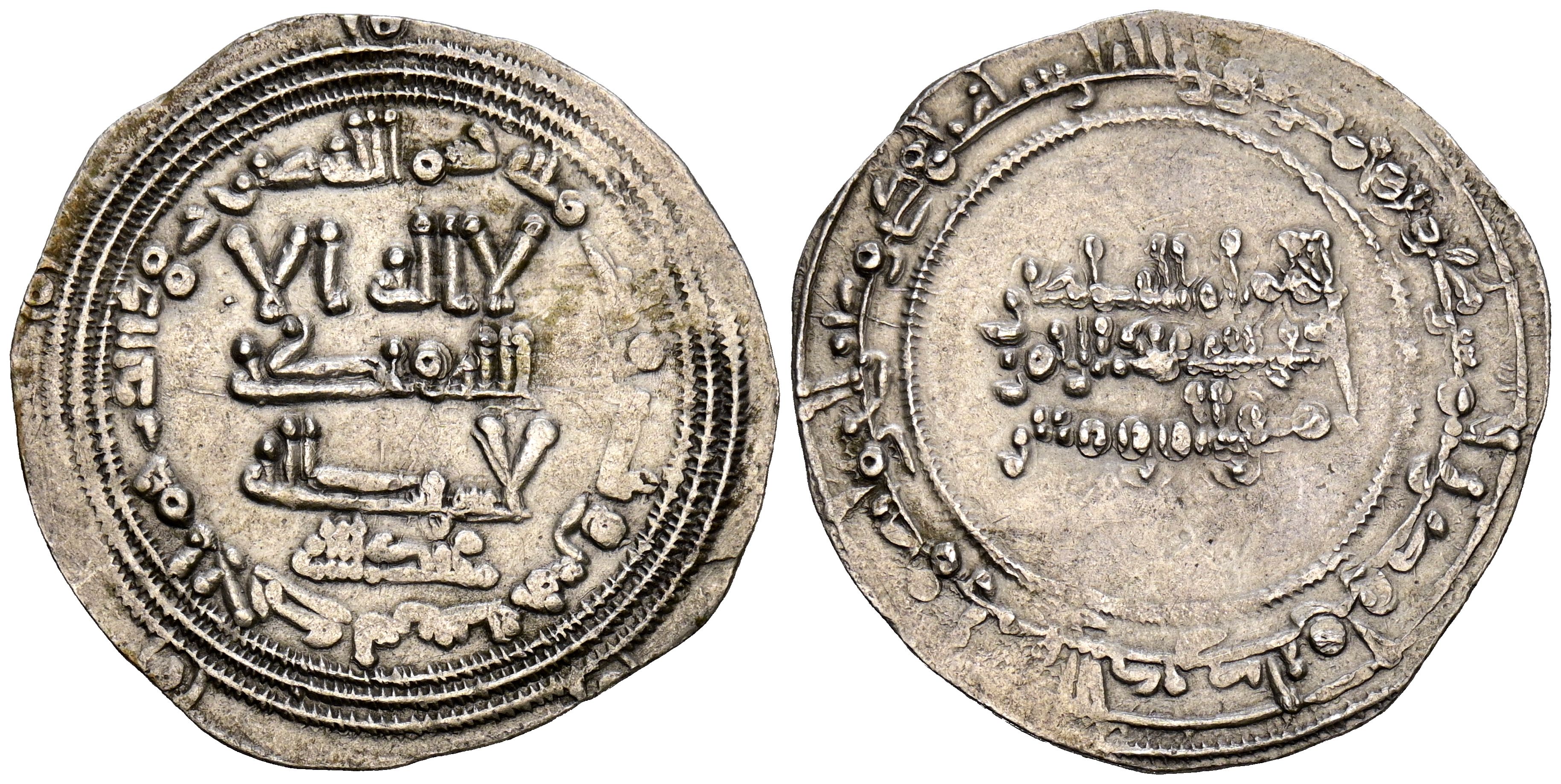CALIPHATE OF CÓRDOBA. 'Abd al-Rahman III. Dirham. (Ar. 2.78g/26mm). 335H. al-Andalus / الاندلس. (Vives 411; Frochoso 335.17). Quoting 'Abd Allāh / عبداللة in IA. Very Fine.