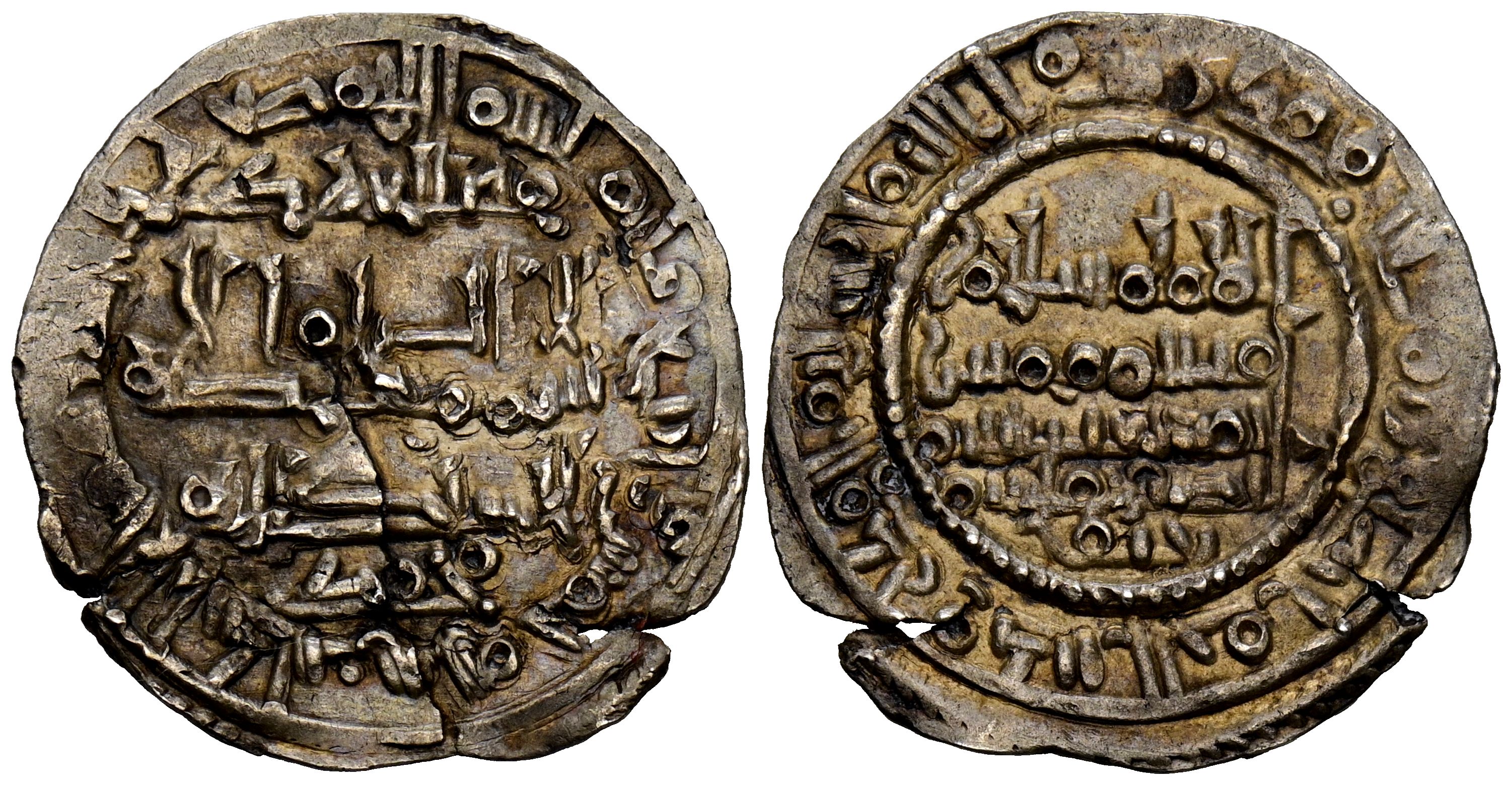 CALIPHATE OF CORDOBA, Suleyman (2nd reign). Dirham. (Ar. 2.47g/22mm). 405H. al-Andalus / الاندلس. (Vives 800; Prieto 30). Quoting Crown Prince Mohammad: محمد / ولى العهد in IA. and Ibn Jalaf / بن حلف in IIA. Very Fine. Internal coinage crack. Very rare specimen with gold monetary tone. Jalaf is probably Hudayl ibn Jalaf ibn Lubb ibn Razin, ruler of the Taifa of Albarracín from 403H to 436H.