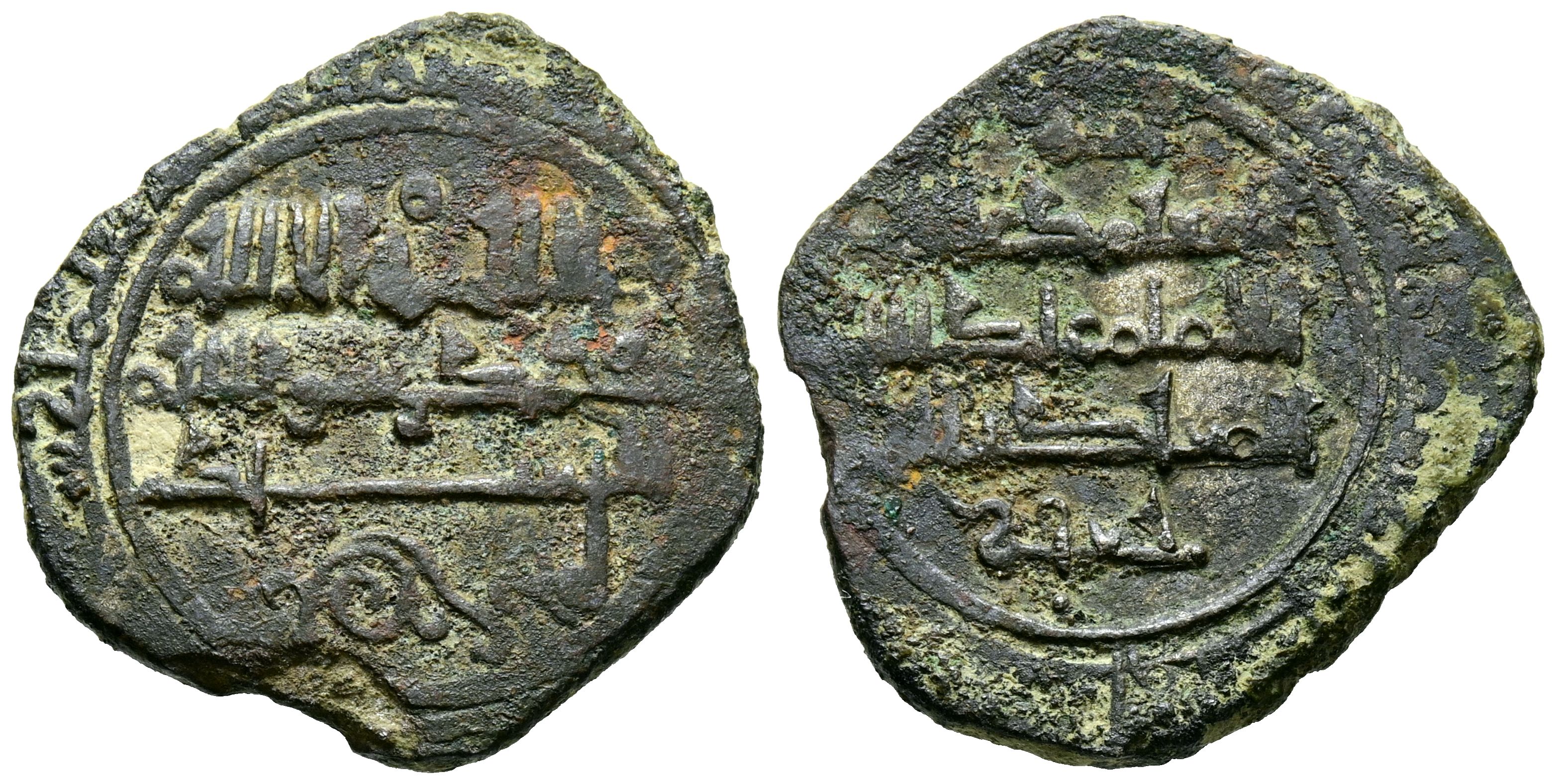 TAIFAS OF THE CALIPHATE, SEVILLE (Abbadíes) WITH ANNEXED MUGoodIA. Muhammad ibn 'Abbad, al-Mu'tamid. Dirham. (Ve. 3.68g/22mm). 481H. Madinat Mursiya (Murcia) / مدينة مرسية. (Vives 986; Prieto 423b-c). Quoting al-Rasīd / الرشيد in IA. and Ibn Ja'far / جعفر/ ابن in IIA. Good Very Fine. Very rare.