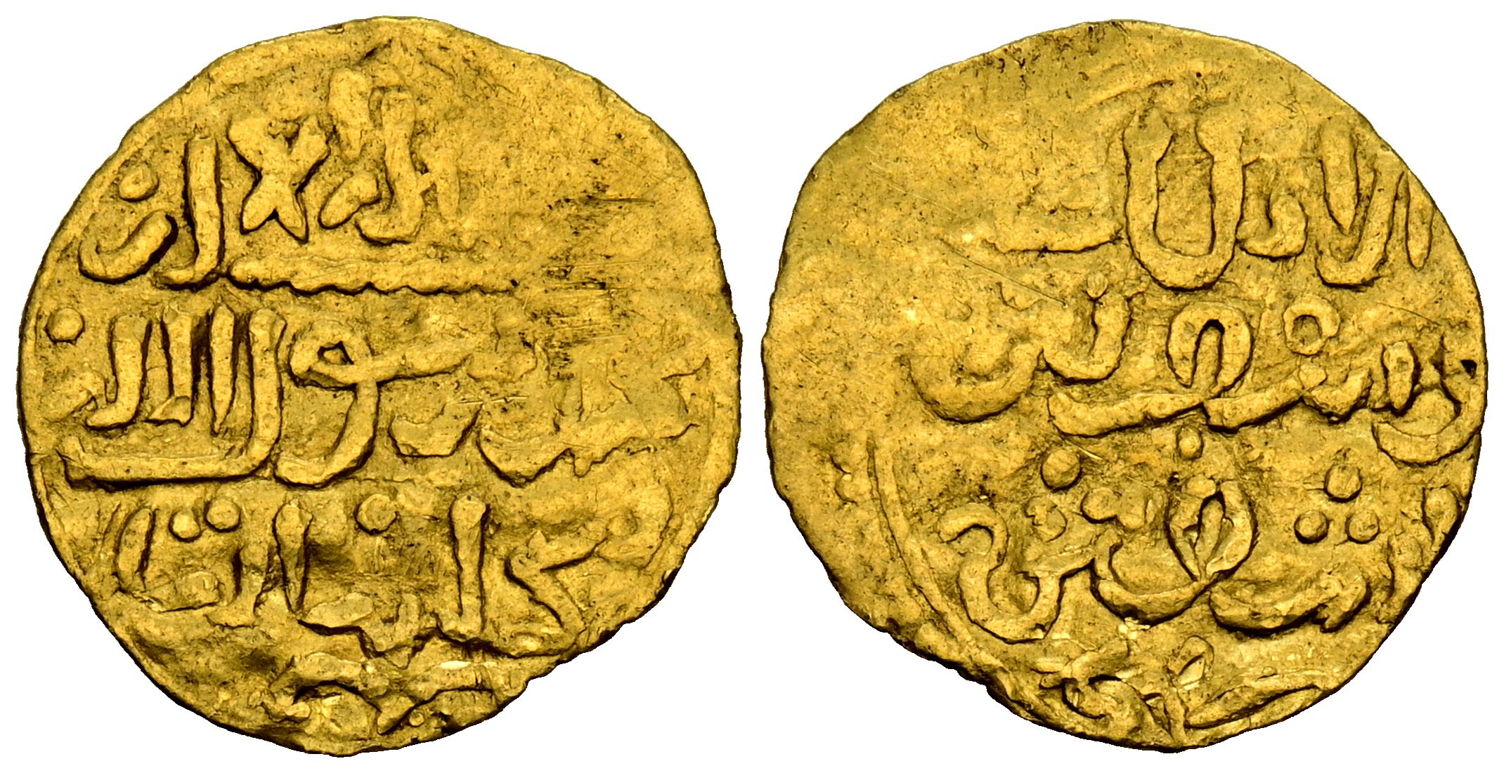 ALMORAVIDES. Yusuf ibn Tashufin (480-500). 1/4 Dinar. (Au. 1.16g/15mm). Sijilmasa (Sejilmesa) / سجلماسة. (Hazard 91; Album 464A). Anv: 'Shahada' in three lines, below ceca: سجلماسة. Rev: الامير (the Emir) / توسف ابن (Yusuf son of) / قا شفين (Tashfin). Very Fine. Queer.