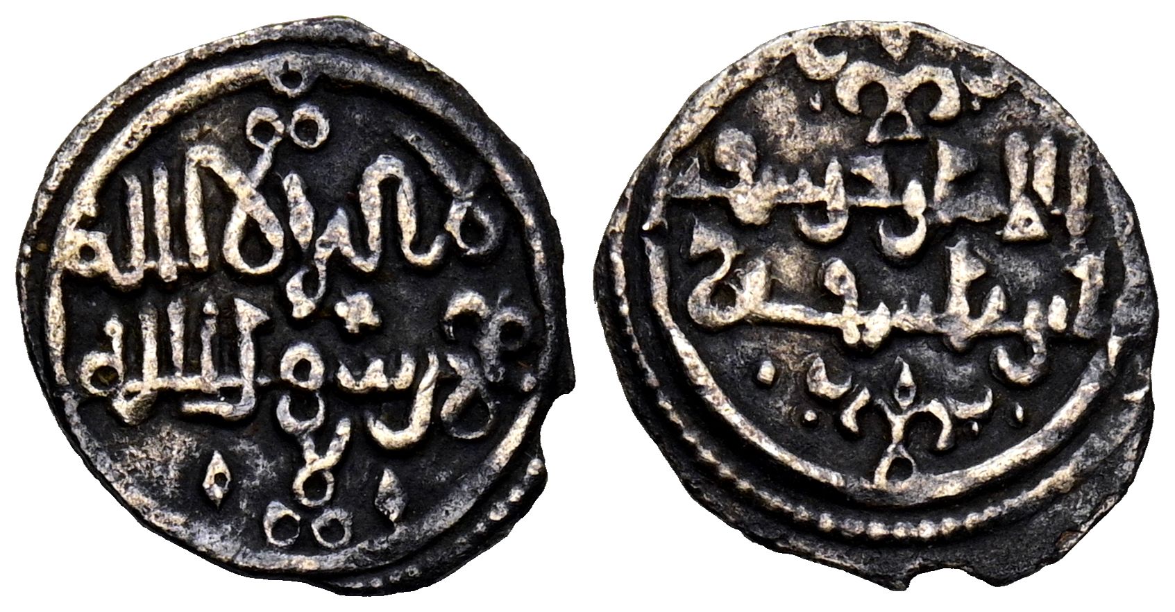 English ALMORAVIDS, Yusuf ben Tashfin (480-500H). Quirate. (Ar. 0.64g/12mm). Uncut. (Vives 1538; Hazard 893; Benedict Ba5). Legends divided into two lines in both areas without mention of an heir (480-497H). VF+. A rare and attractive example with a beautiful variant of the script on the obverse.