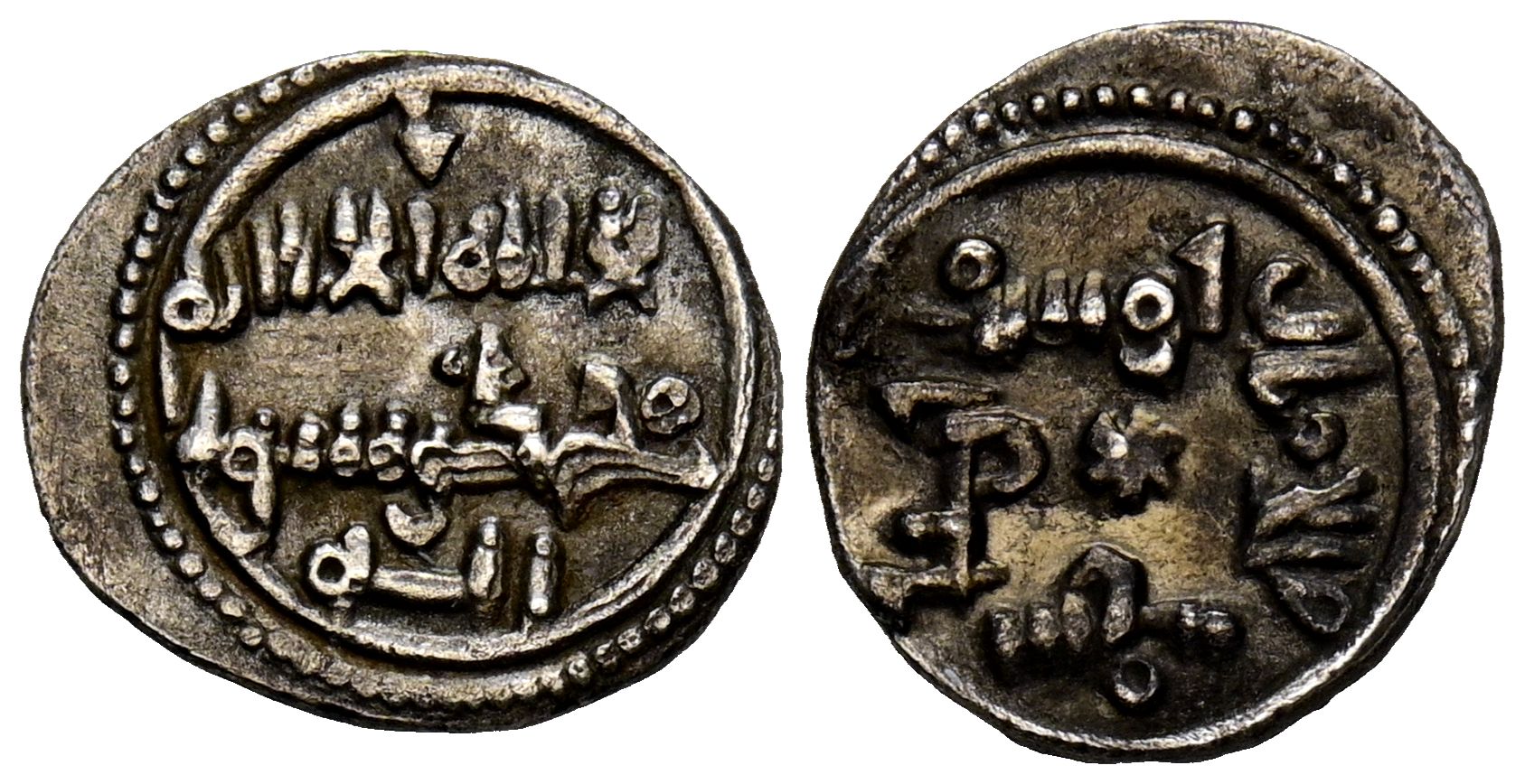 English ALMORAVIDS, Yusuf ben Tashfin (480-500H). Quirate. (Ar. 0.80g/12mm). S/D. (Vives does not cite; Hazard does not cite; Eustache 83a; Benito Ba14). Obv: 'Shahadah' in three lines. Rev: شفين (sufin)/ ابن قا (son of Ta)// توسف (Yusuf)/ الامير (the Emir) , in square with central star. Uncirculated. Very rare.
