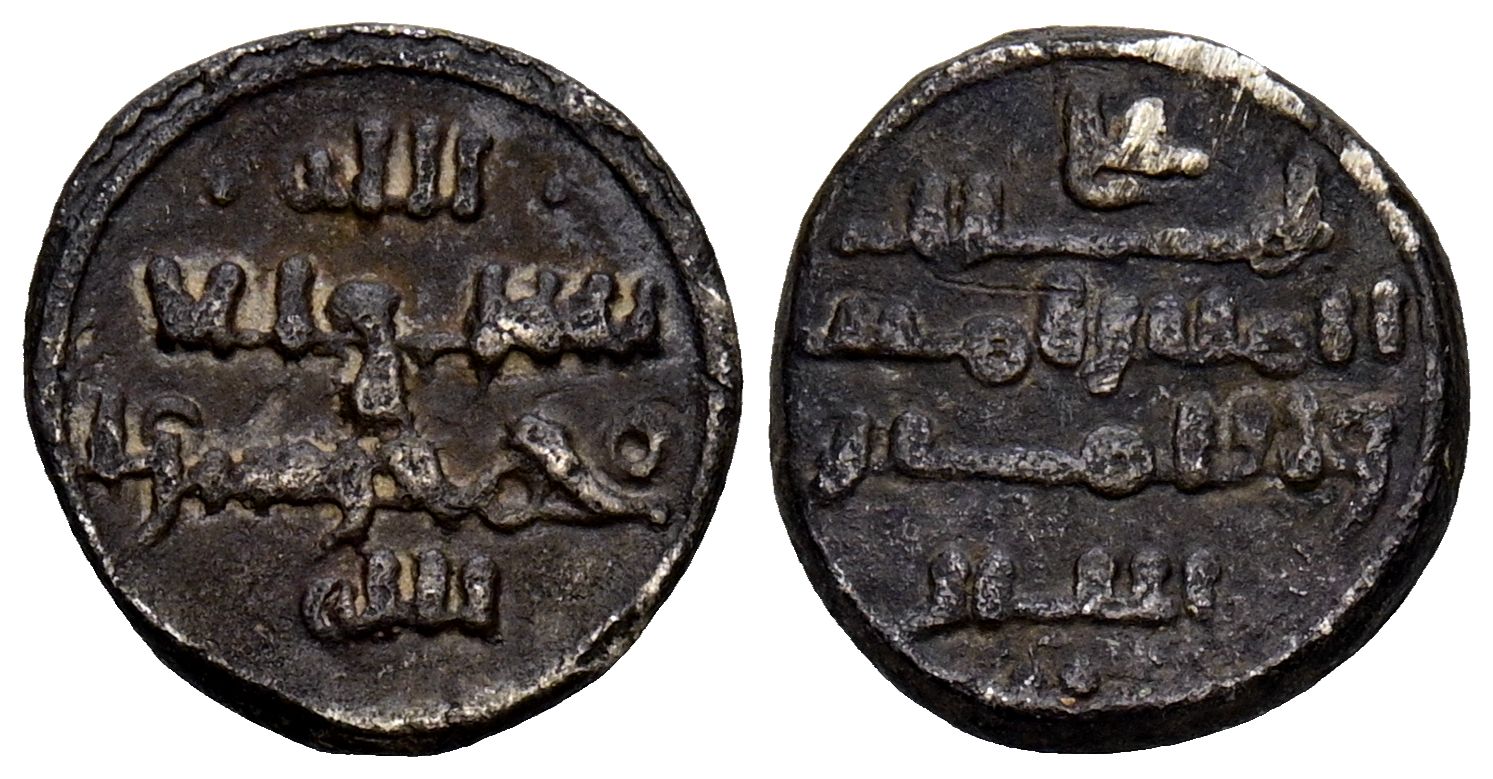 ALMORAVIDS, Ali ibn Yusuf and the Emir Sïr (522-533H). Quirate. (Ar. 0.75g/10mm). S/D. (Vives 1768; Benito Ce8). Obv: 'Shahada' in four lines. Rev: It presents Ali with the titles of Amir al-Muslimin and Nasir al-Din, below in two lines mention of the heir: سير / و الامير. VF+. Dark patina.