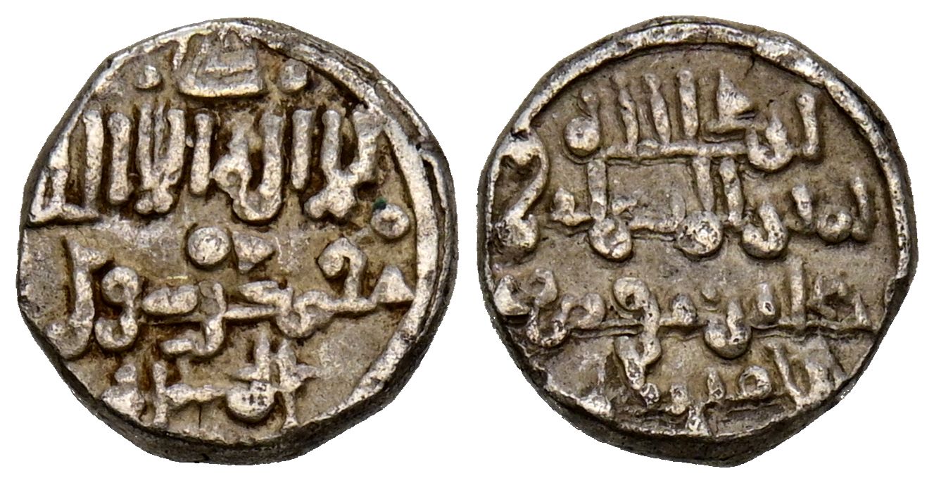 English ALMORAVIDS, Ali ben Yusuf and the Emir Sir (522-533H). Quirate. (Ar. 0.94g/9mm). S/D. (Vives does not cite; Matínez 26; Benito Ce13). Obv: 'Shahada' in three lines. Rev: Presents Ali with titles of Amir al-Muslimin, above: ايد الله, below mention of the heir: الامير سير. VF. Scarce.