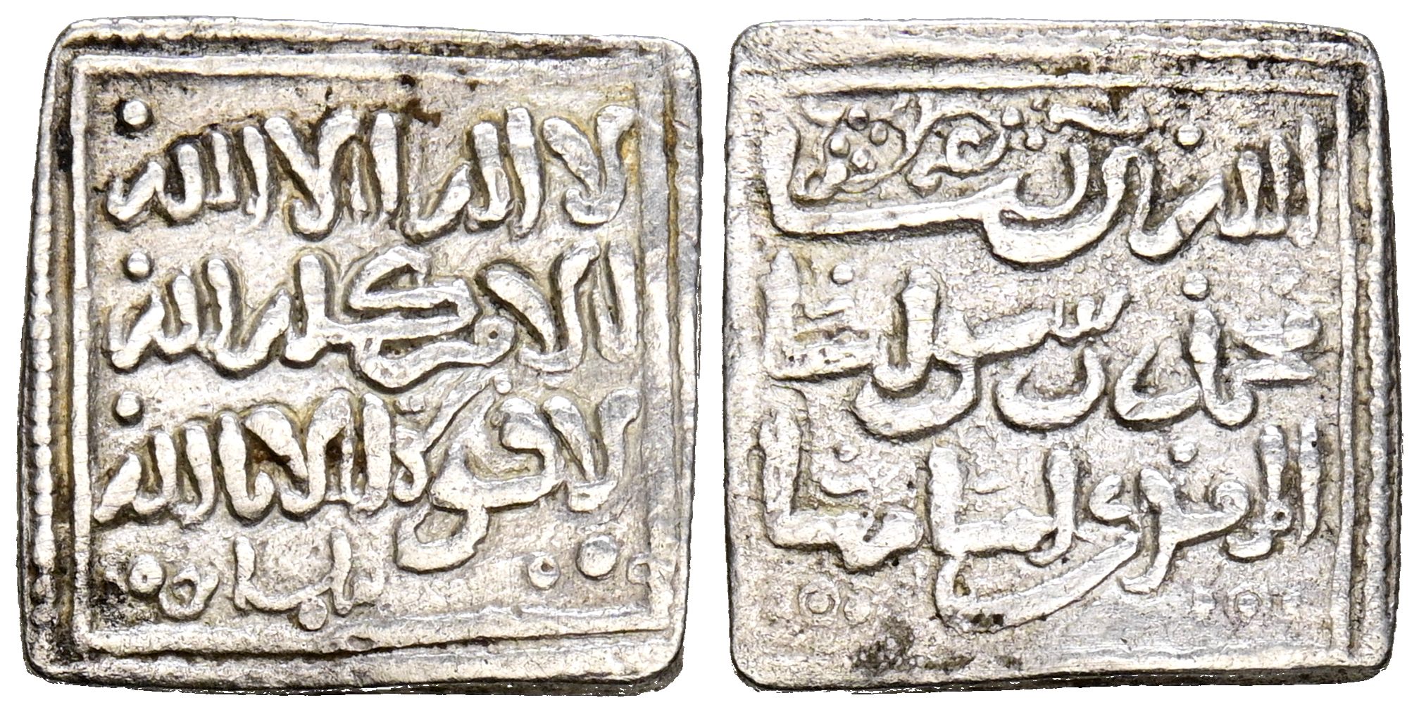 English PILLOWS. Anonymous in the name of Imam Al-Mahdi. Dirham. (Ar. 1.53g/14mm). Tlemecen / تلمسان. (Vives 2101; Hohertz 614a). Good Very Fine. Warped