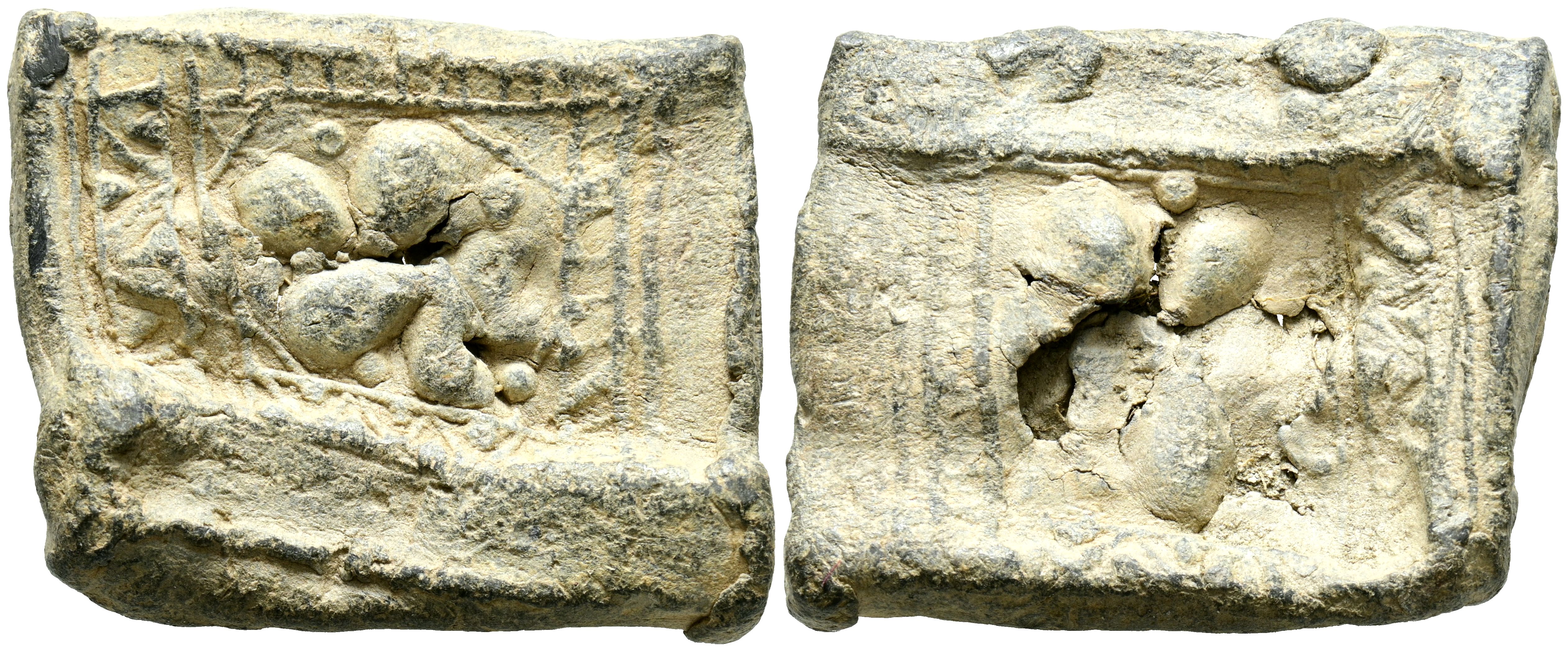 CALIPHAL OR TAIFAS PERIOD. Amulet-case. (Pb. 22.52g/34x28x7mm). Possibly 10th-11th century. Rectangular lead case with an opening on the shorter right side and remains of two suspension elements at the top. In both areas, a central flower with five petals framed by a band decorated with horizontal lines and triangles. Good Fine.