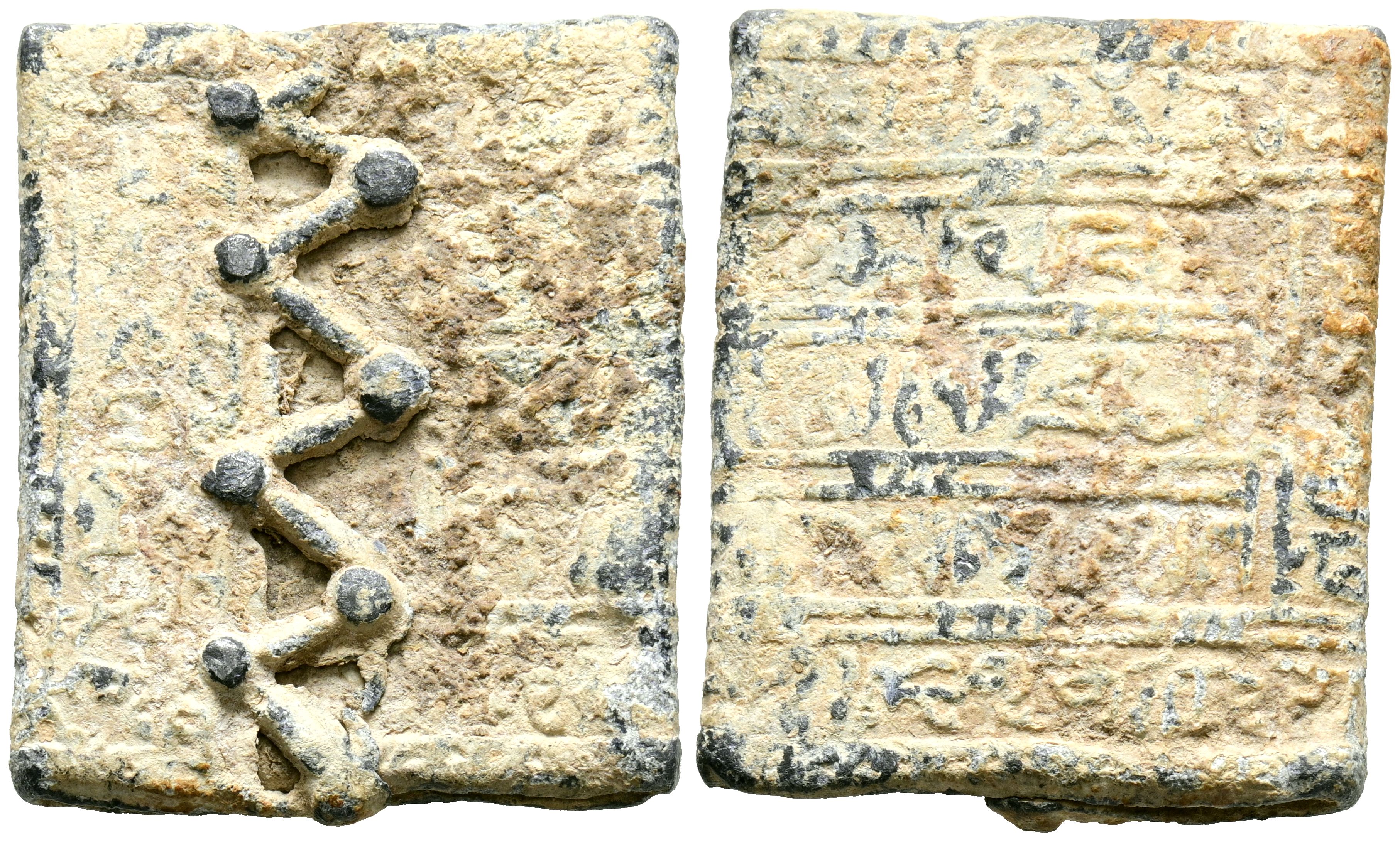 Taifa or Almoravid Period. ''Central sector'' amulet. (Pb. 14.05g/30x24mm). Possibly 11th century. Rectangular lead plaque folded into a closed triptych and finished with triangular crenellations at the top edge. The visible part features a simple Kufic Quranic text that runs along a band bordering the piece and in the three rectangles that make up the central cartouche. (Type AV amulets). VF+. Unpublished.