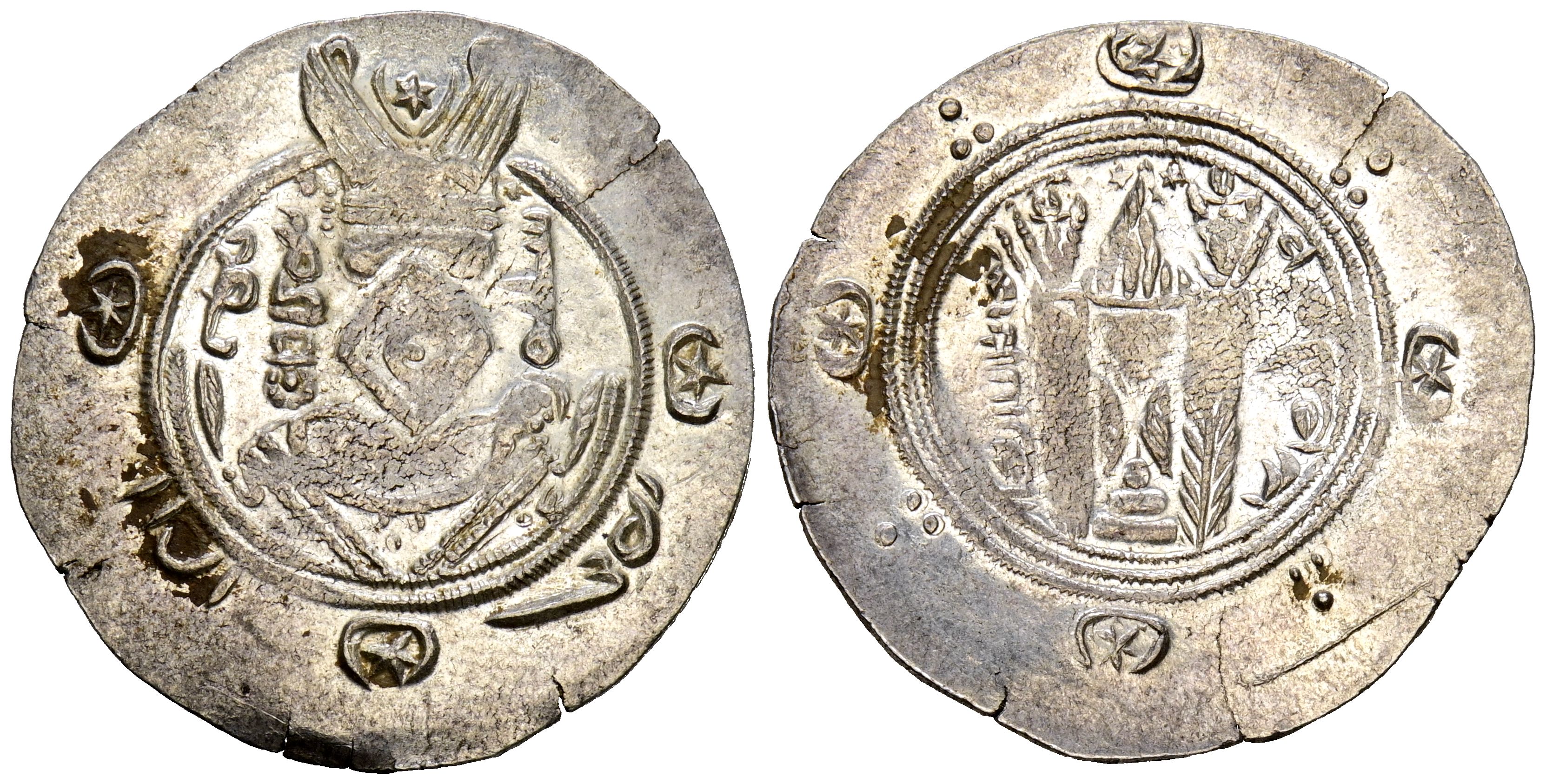 English ABBASID CALIPHATE, Governor Sulaiman. Tabari dirham. (Ar. 1.57g/24mm). 137 PYE/172H/788-9 AD Tabaristan. (Malek 101.1-8; Album 65). Obv: Sassanian pseudo-bust with a rhombus instead of a head, on the right: ????? (Sulayman), on the left the Palavhi legend: GDH (Splendor). Outside, at 2 o'clock, 6 o'clock and 10 o'clock, a crescent and a star. Below right, the Palavhi word: ADB (Excellent) and on the left, NEK (Good). Rev: Fire altar flanked by two priests, on the right: Tapurstan (Tabaristan), on the left: year of minting: 137 PYE (Post Yazgard Era) within 3 borders, on the outside, at 12 o'clock, 3 o'clock, 6 o'clock and 9 o'clock a crescent and a star, and in the middle of these ornaments 3 triangular dots. VF. Traces of original luster.