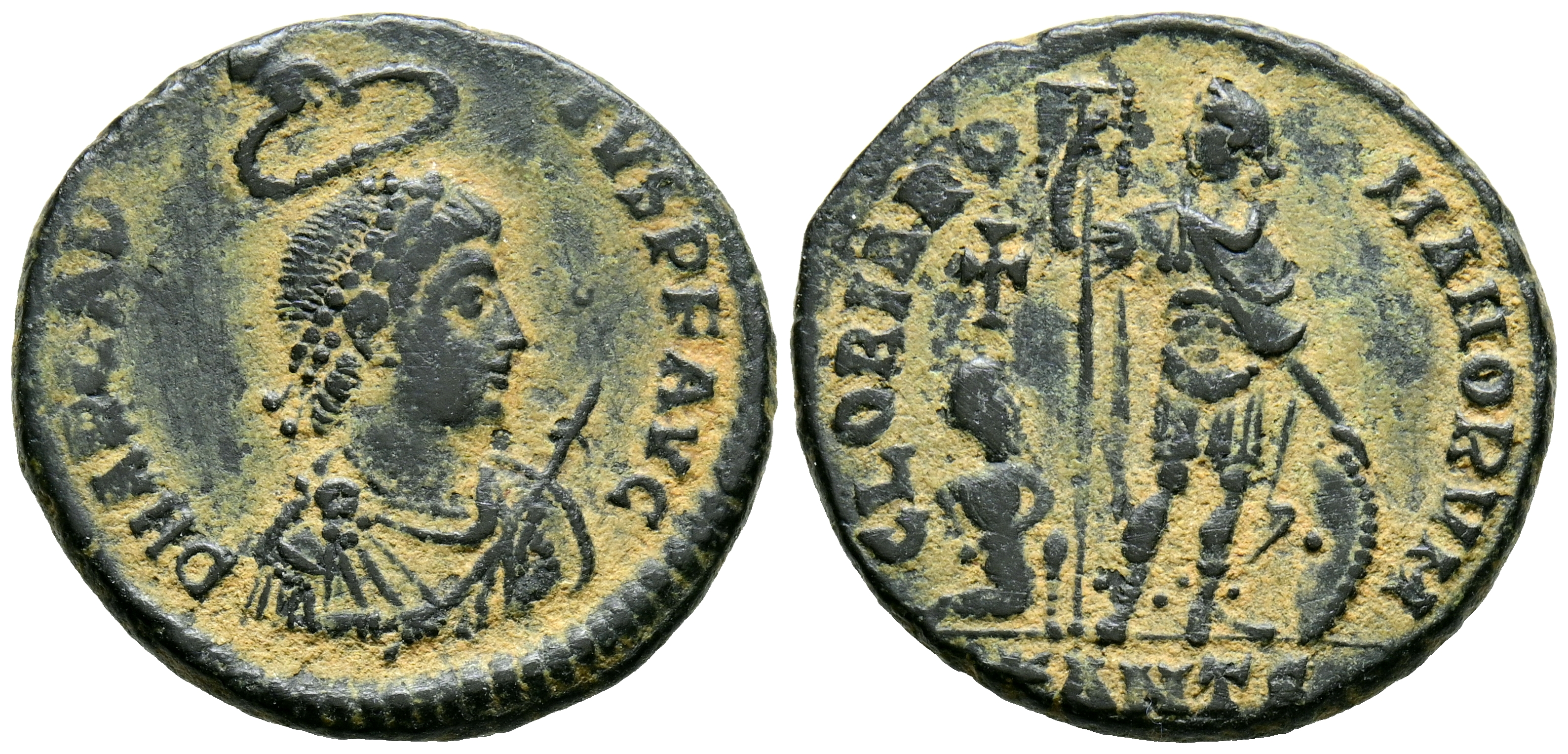 English AGoodADIUS. Follis. (Ar. 5.21g/22mm). 383-388 AD Antioch. (RIC 80). Obv: Diademed, draped, and cuirassed bust of Arcadius facing right, above him a laurel wreath held by the hand of God, around legend: DN AGoodADIVS PF AVG. Rev: Arcadius standing, carrying a labarum and shield, at his feet a captive, in the field a cross, in exergue: ANTS, around legend: GLORIA ROMANORVM. Very Fine.