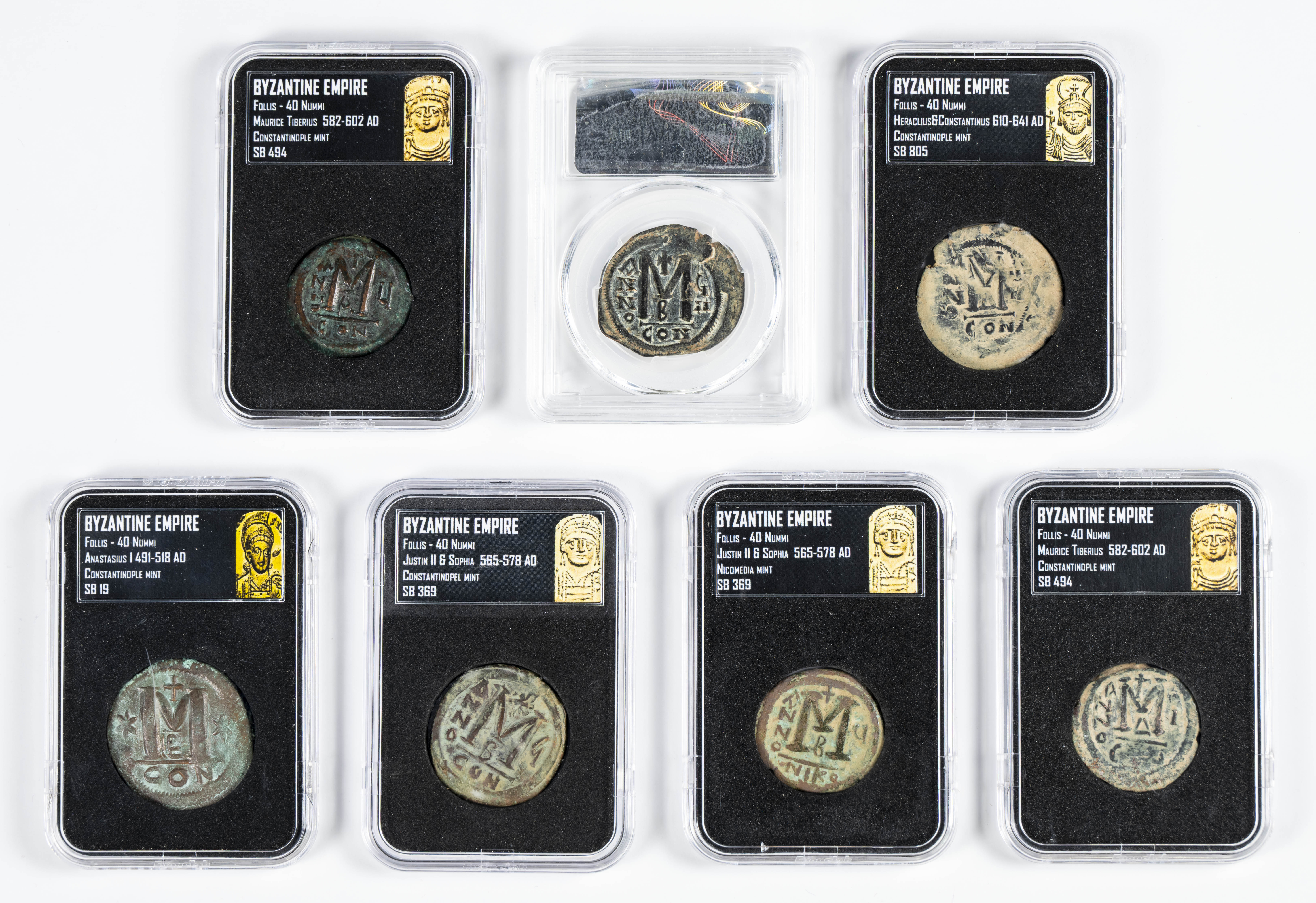 Interesting and beautiful set of 7 folles from different emperors, with varying dates and states of preservation. TO BE EXAMINED.