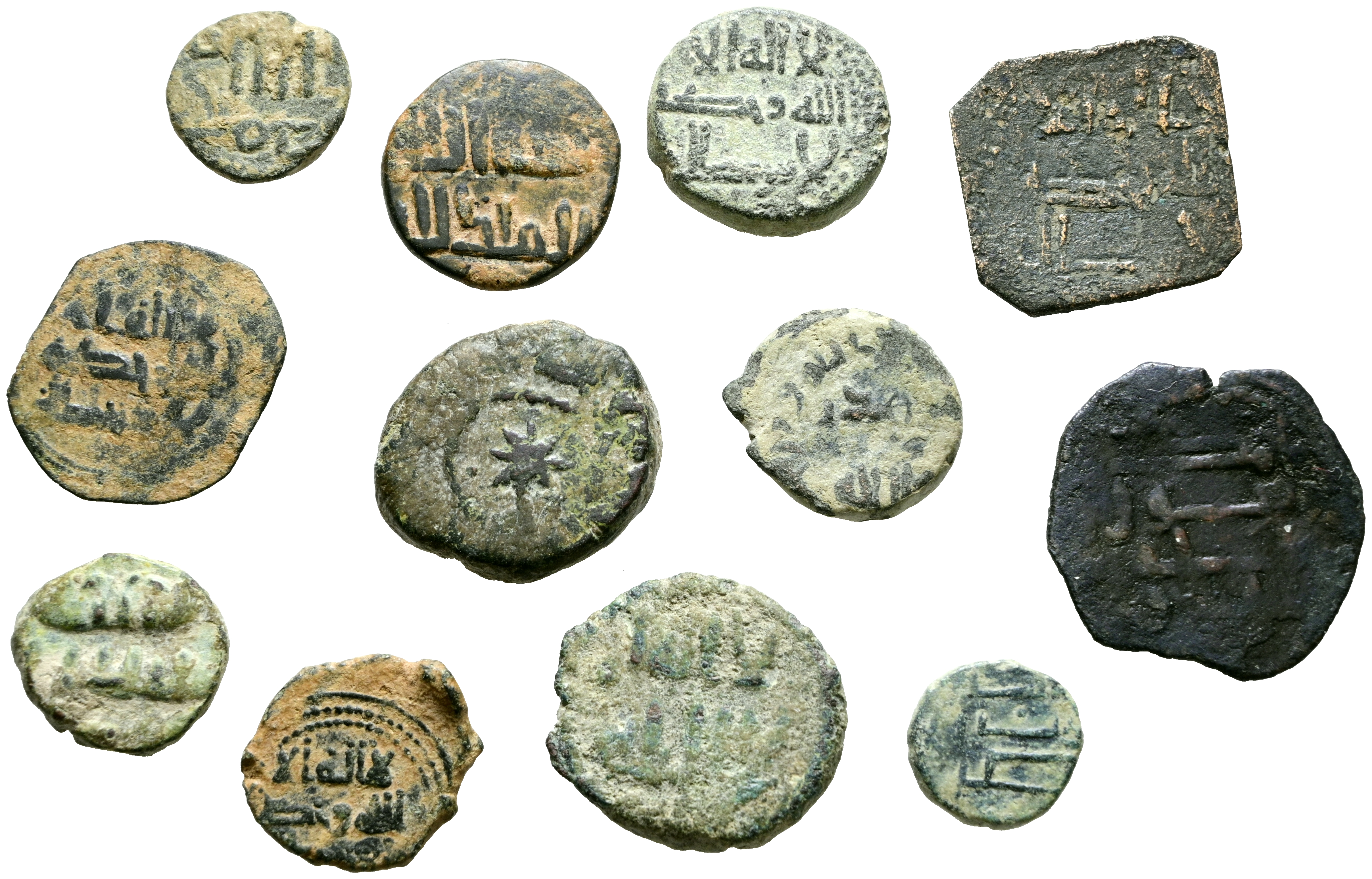 A fascinating collection of 12 fuluses from the period of governors and the independent emirate. Most are of different types, including Frochoso XVII and XVIII, minted in al-Andalus. They vary in size, weight, and state of preservation. For examination.