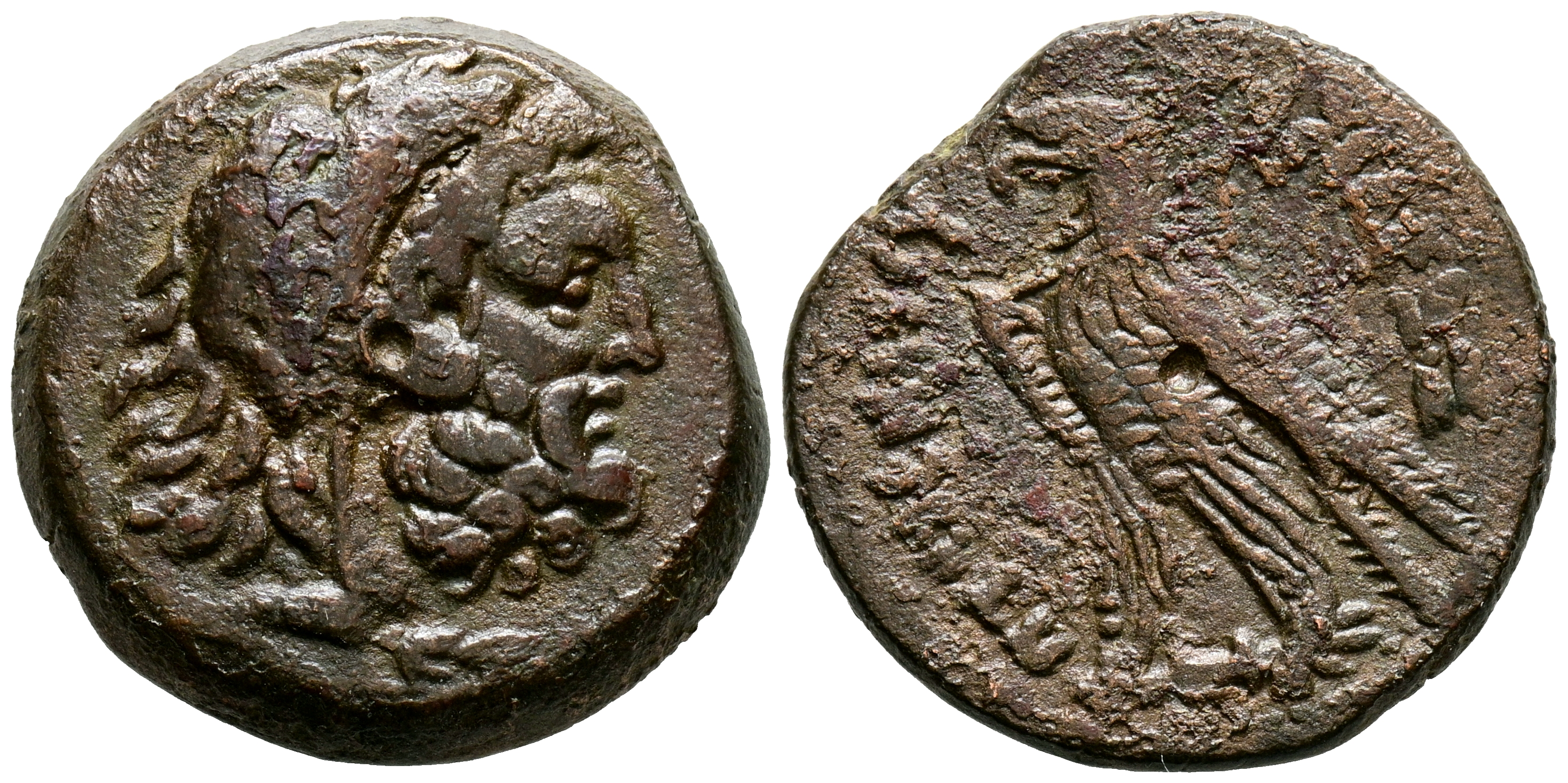 PTOLEMAIC KINGDOM, Ptolemy V. Ae23. (Ae. 9.46g/23mm). 204-180 Fine Alexandria. (Svoronos 1494; SNG Copenhagen 339-43). Obv: Bearded head of Heracles facing right, wearing a lion skin headdress. Rev: Eagle with closed wings standing left on a thunderbolt, around legend: PTOLEMAIOY BASILES. Very Fine-.