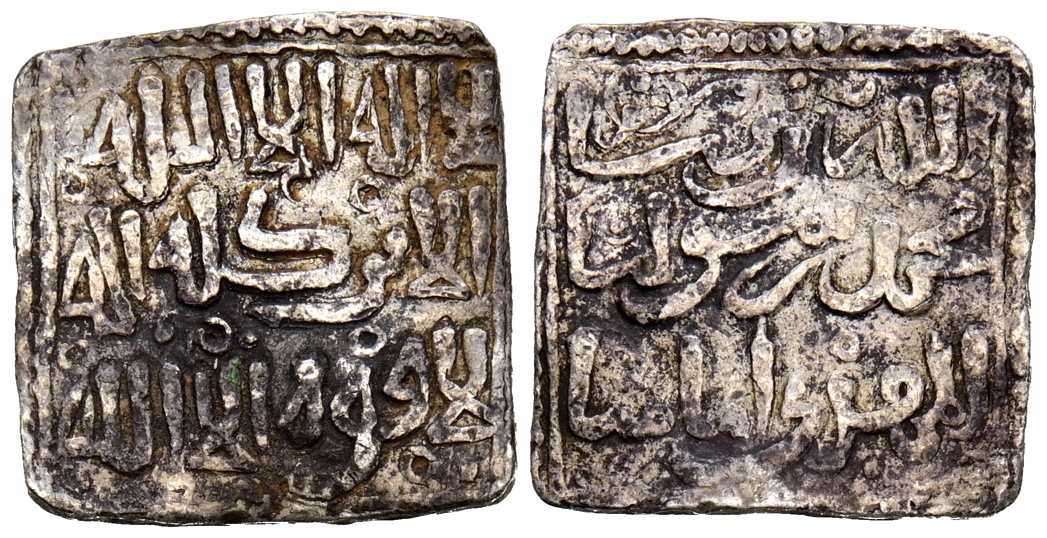 English ALMOHADS, Anonymous in the name of Al-Mahdi. Dirham. (Ar. 1.46g/45mm). Undated. (Hazard 1103a; Hohertz 577). Variant with Kufic script on the obverse and Naskh on the reverse. Very Fine. Warped. Very rare.