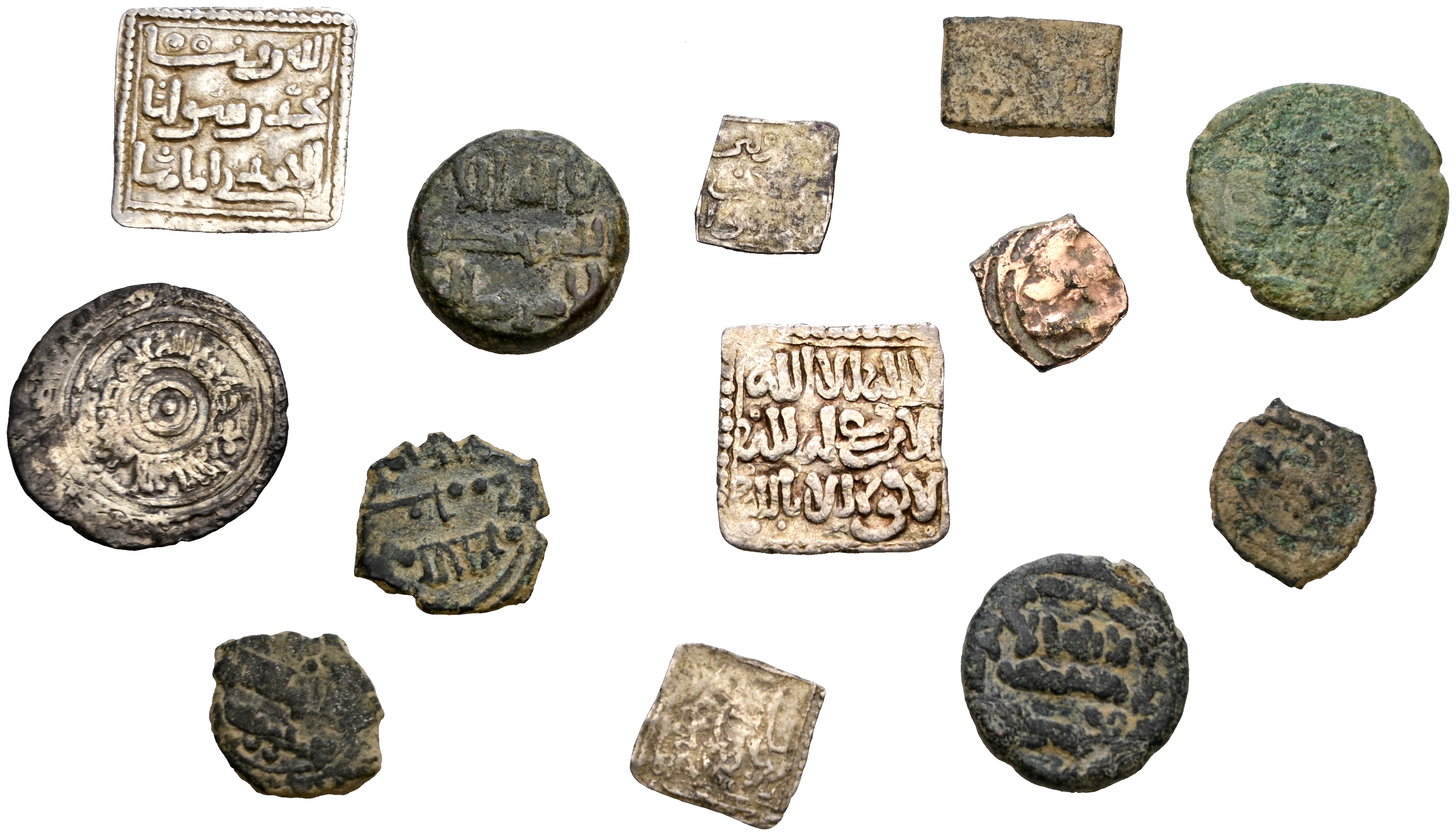Interesting collection of 13 coins from the Governors', Taifa, Caliphate, and Almohad periods. Includes one Fatimid silver coin. Various materials, sizes, weights, and qualities. For examination.