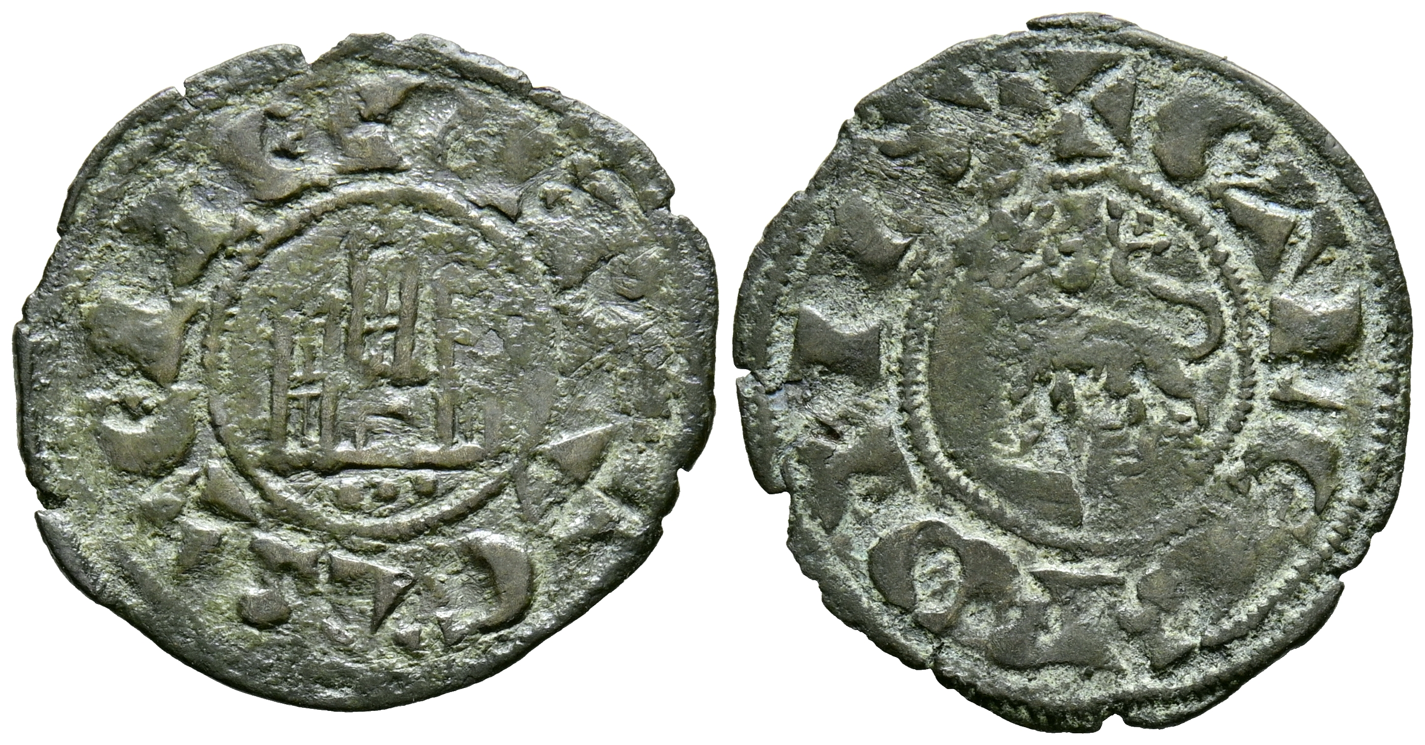 FERNANDO IV (1295-1312). Dinero. (Ve. 0.85g/20mm). Undetermined, mint mark three dots. (Imperatrix F4:2.43; FAB-328 as a pepion). Obv: Castle, below three dots, all within a circular border, around legend: F REX CASTELLE. Rev: Lion to the left within a circular border: ET LEGIONIS. VF+.
