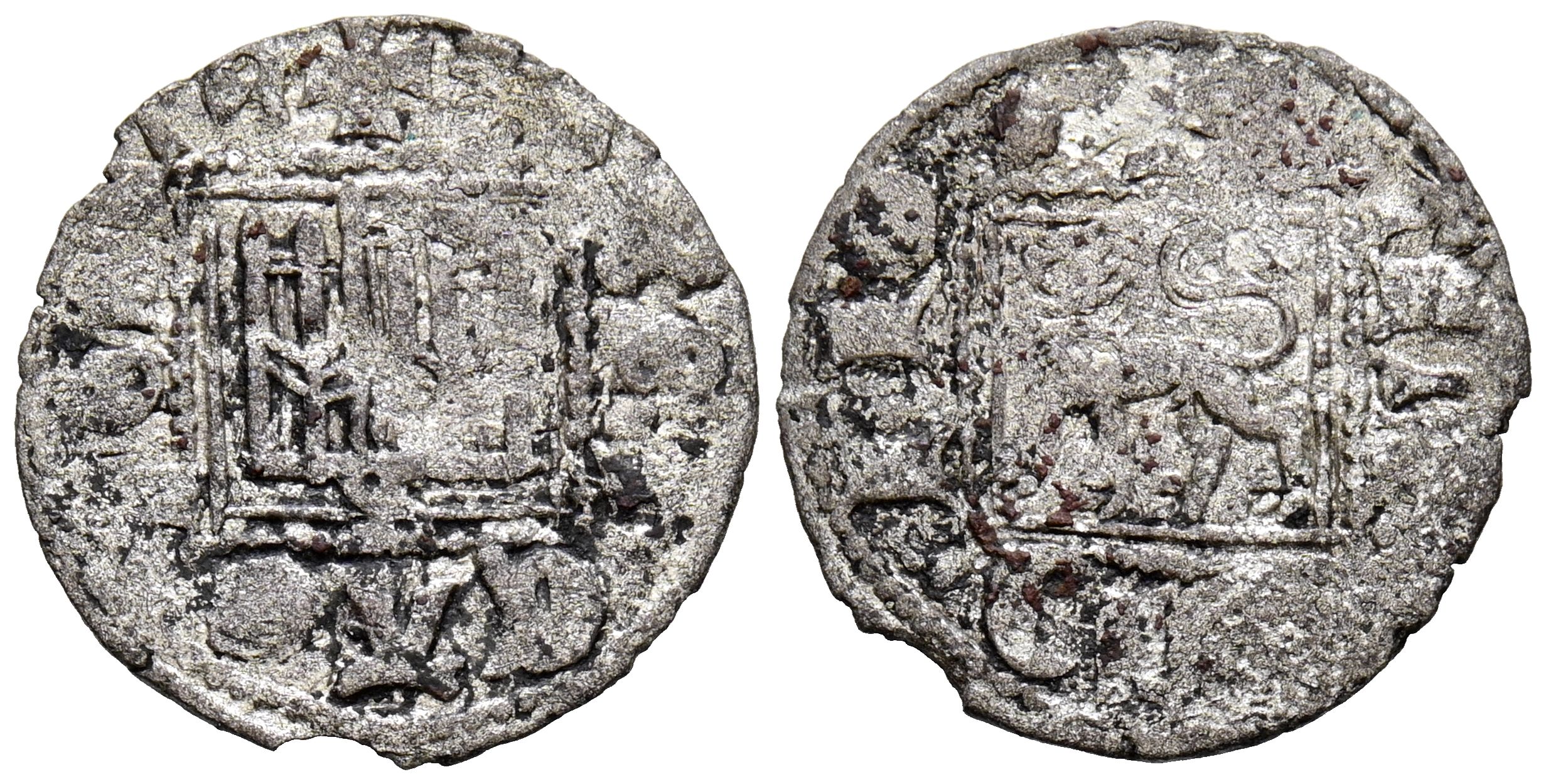 ALFONSO XI (1312-1350). Dinero Novén. (Ve. 0.65g/17mm). Seville. (Imperatrix A11:1.19; FAB-358). Obv: Castle, below recumbent S, all within a square border, around legend: ALF REX CASTELLE. Rev: Lion passing to the left, around legend: ET LEGIONIS. Very Fine-.