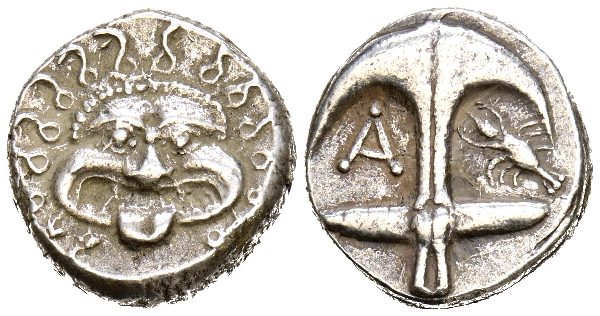 THRACE, Apolonia Pontica. Drachma. (Ar. 2.50g/14mm). 480-450 Fine (SNG BM 153). Obv: Gorgon head facing forward. Rev: Anchor between lobster and A. Very Fine.