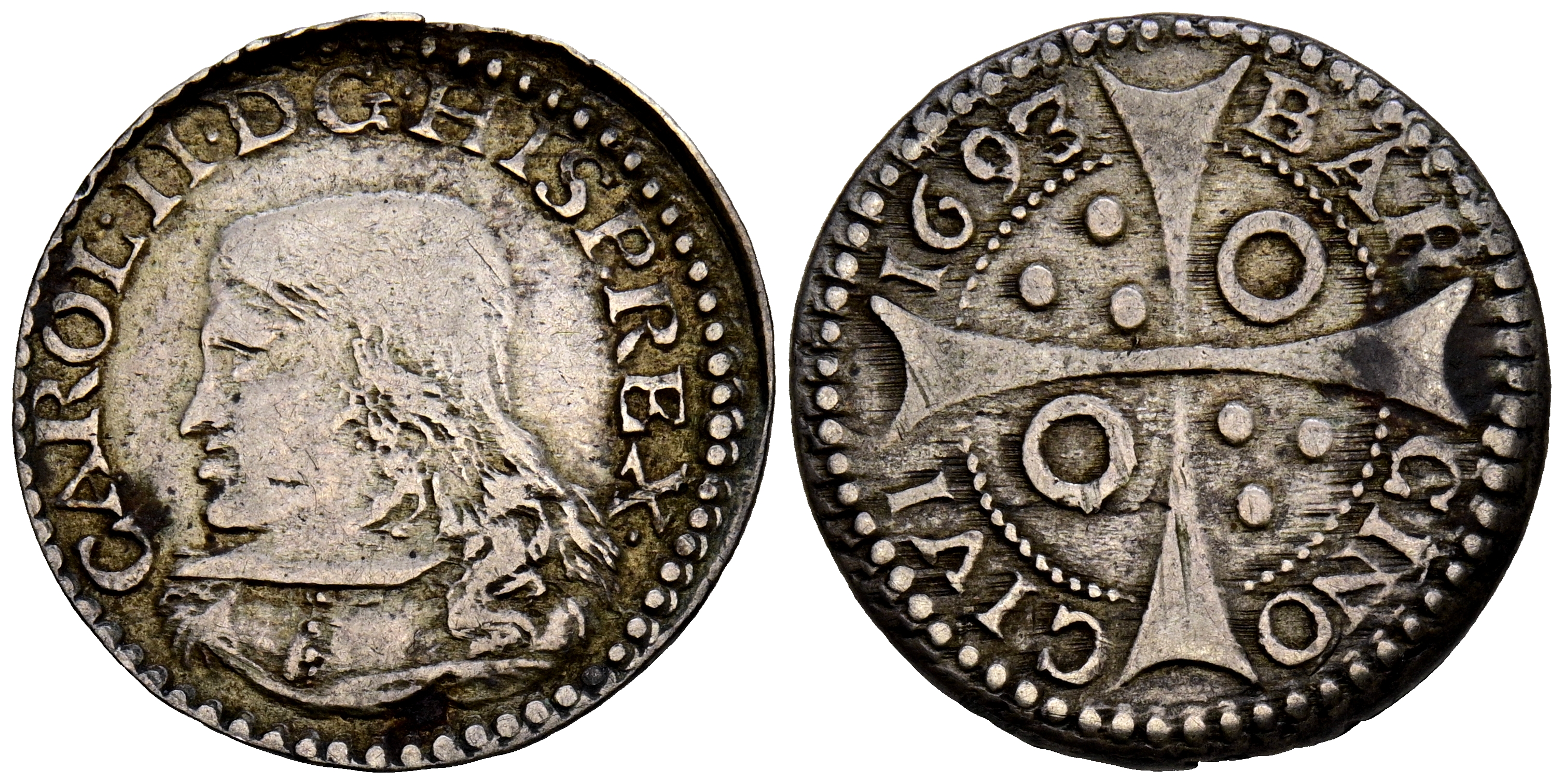 English CHARLES II (1665-1700). 1 Croatian (Ar. 2.43g/21mm). 1693. Barcelona. (Cal-2019-211). Very Fine.
