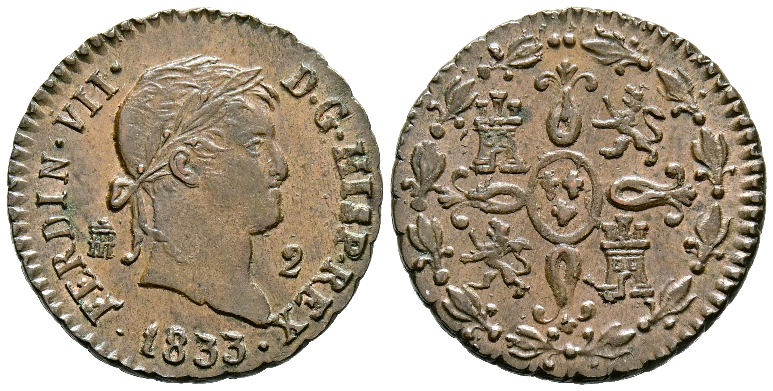 FERDINAND VII (1808-1833). 2 Maravedis. (Ae. 2.45g/20mm). 1833. Segovia. (Cal-2019-157). Extremely Fine.