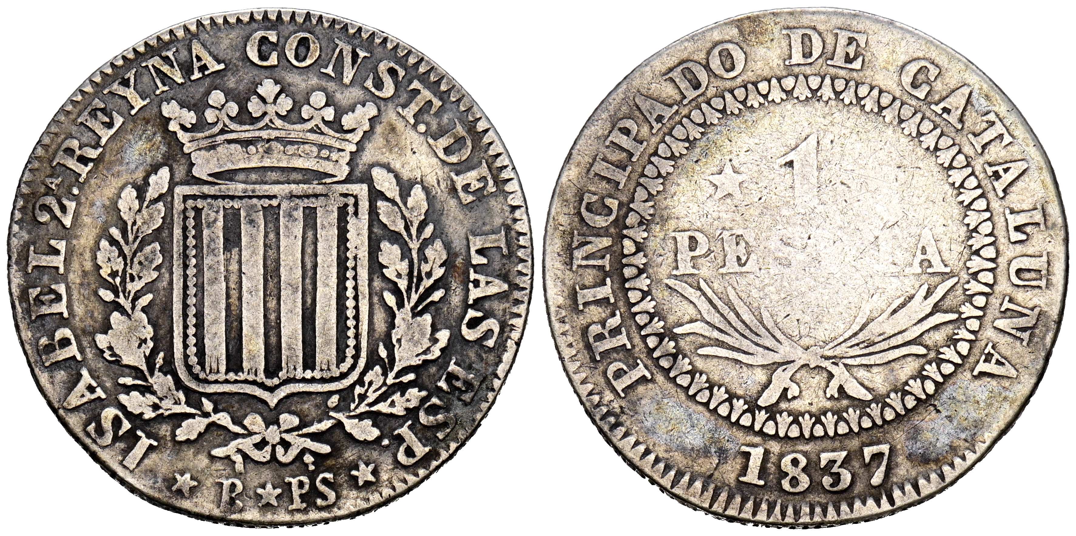 ELIZABETH II (1833-1868). 1 Peseta. (Ar. 5.54g/25mm). 1837. Barcelona PS. (Cal-2019-272). Very Fine/Good Fine.