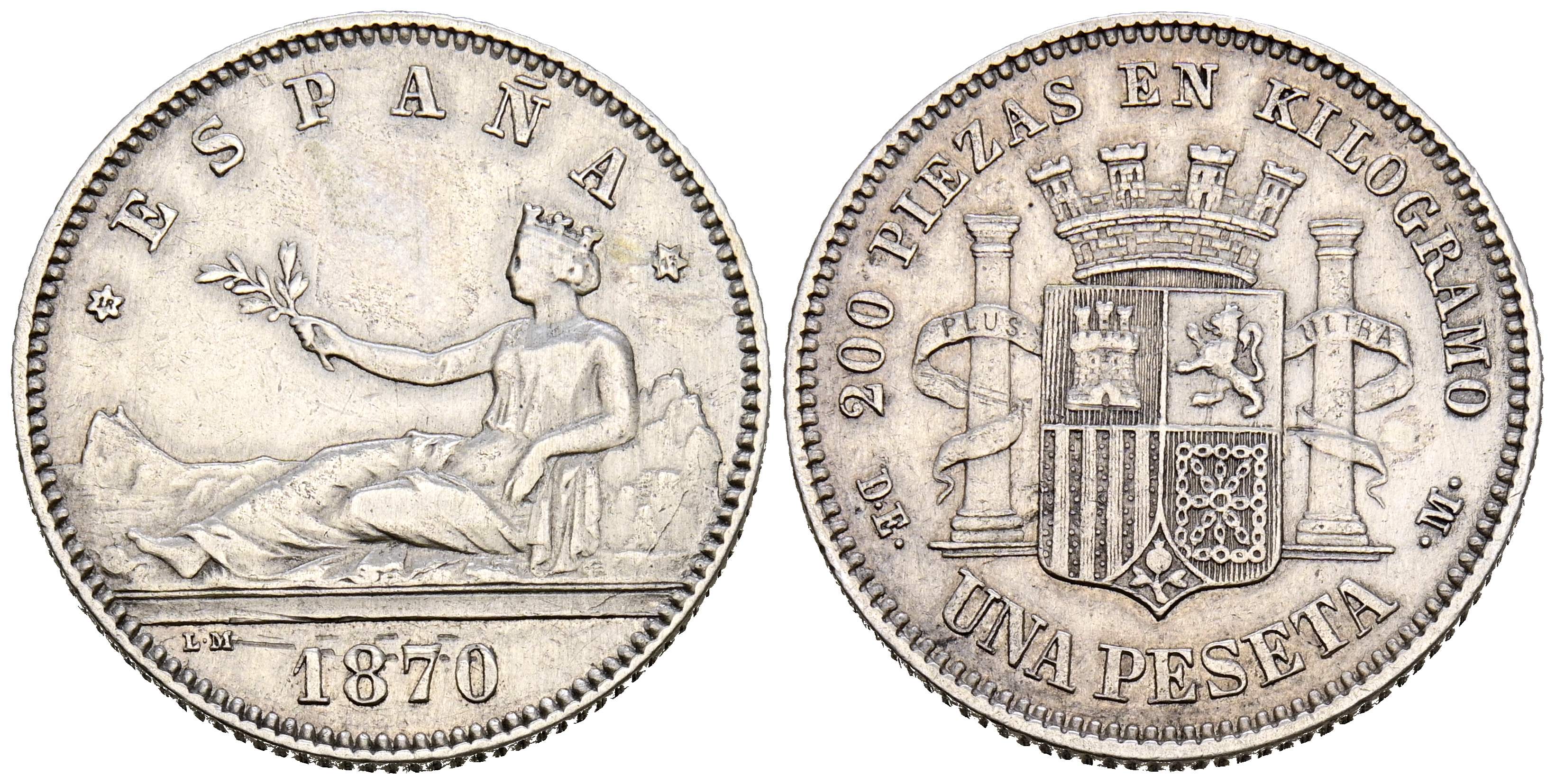 PROVISIONAL GOVERNMENT (1868-1871). 1 Peseta. (Ar. 4.92g/23mm). 1870 *18-73. Madrid DEM. (Cal-2019-19). VF. Stars perfectly visible.
