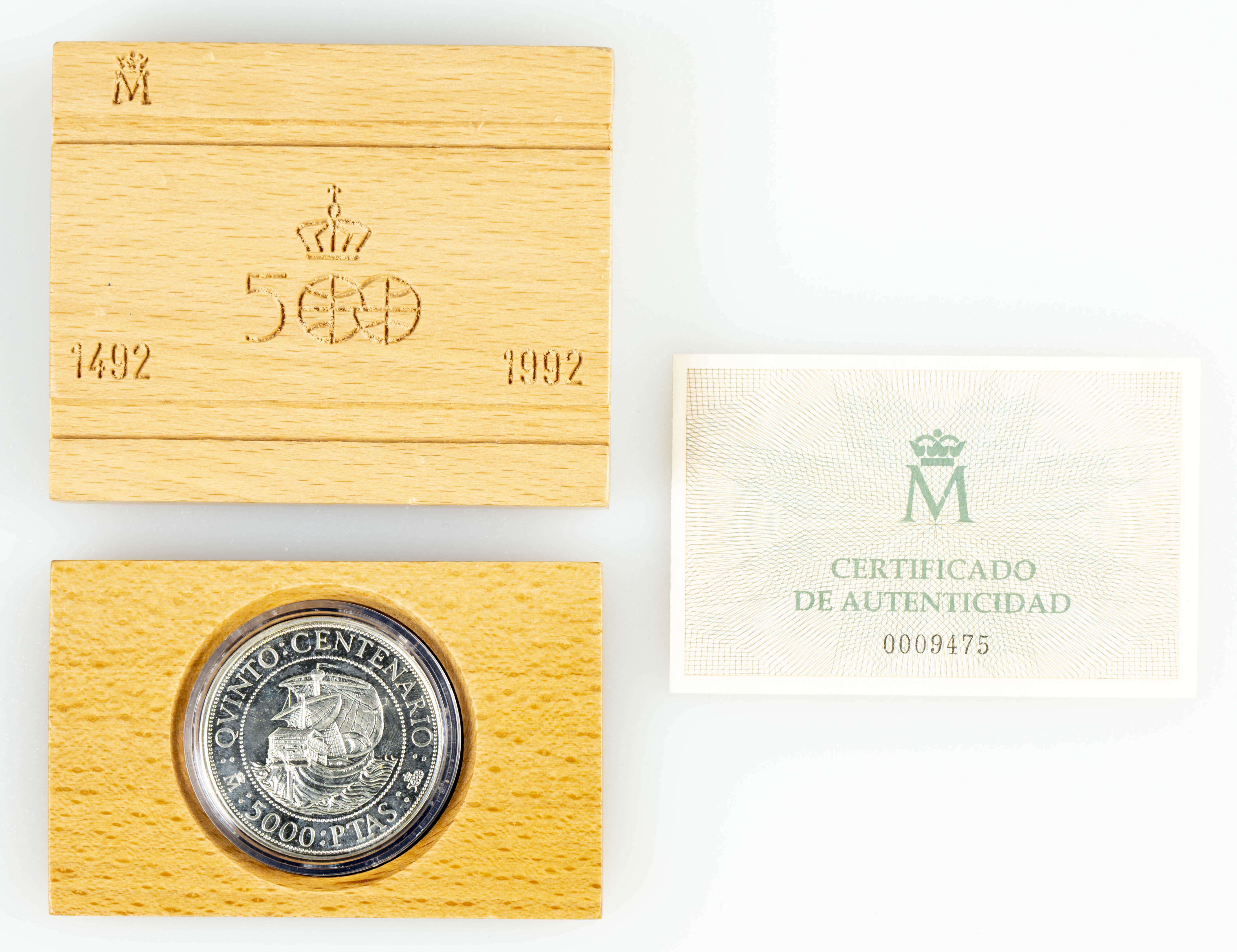 JUAN CARLOS I (1975-2014). 5000 pesetas. (Ar. 54.00g/40mm). 1989. FNMT. Fifth Centenary. Series I. FDC. Includes original case and certificate of authenticity.