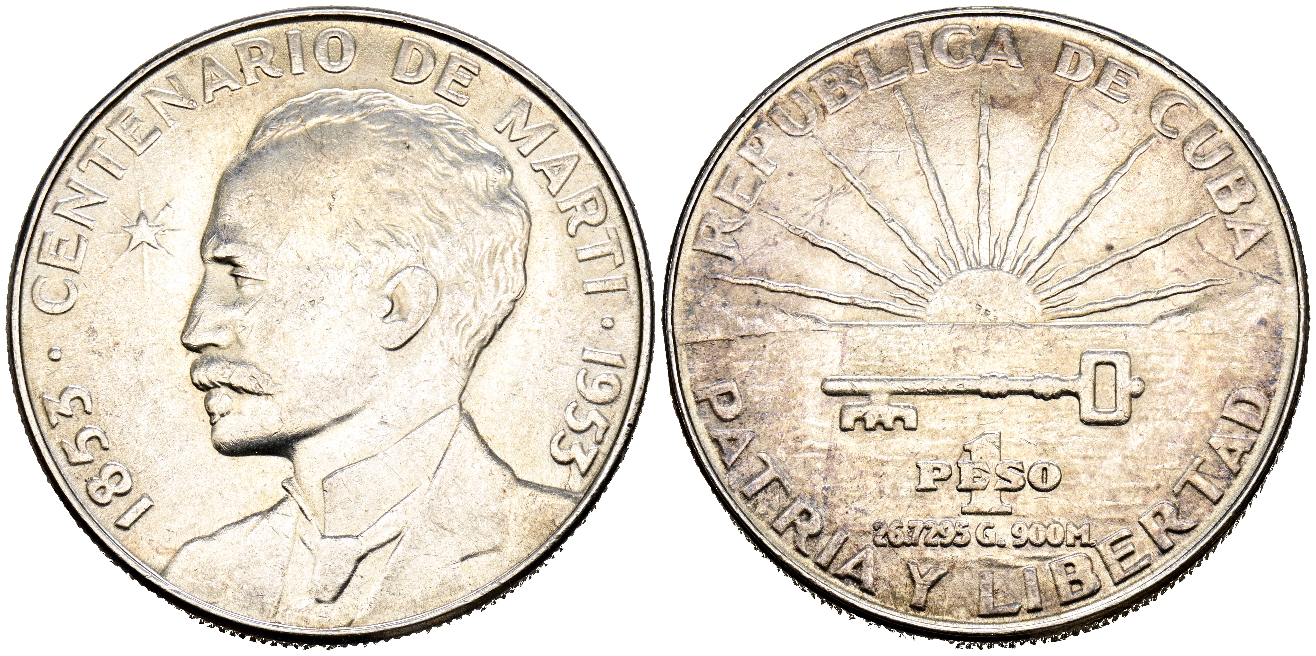 CUBA. 1 Peso. (Ar. 26.73g/38mm). 1953. Centenary of the Birth of José Martí (1853-1953). (Km#29). Good Very Fine.