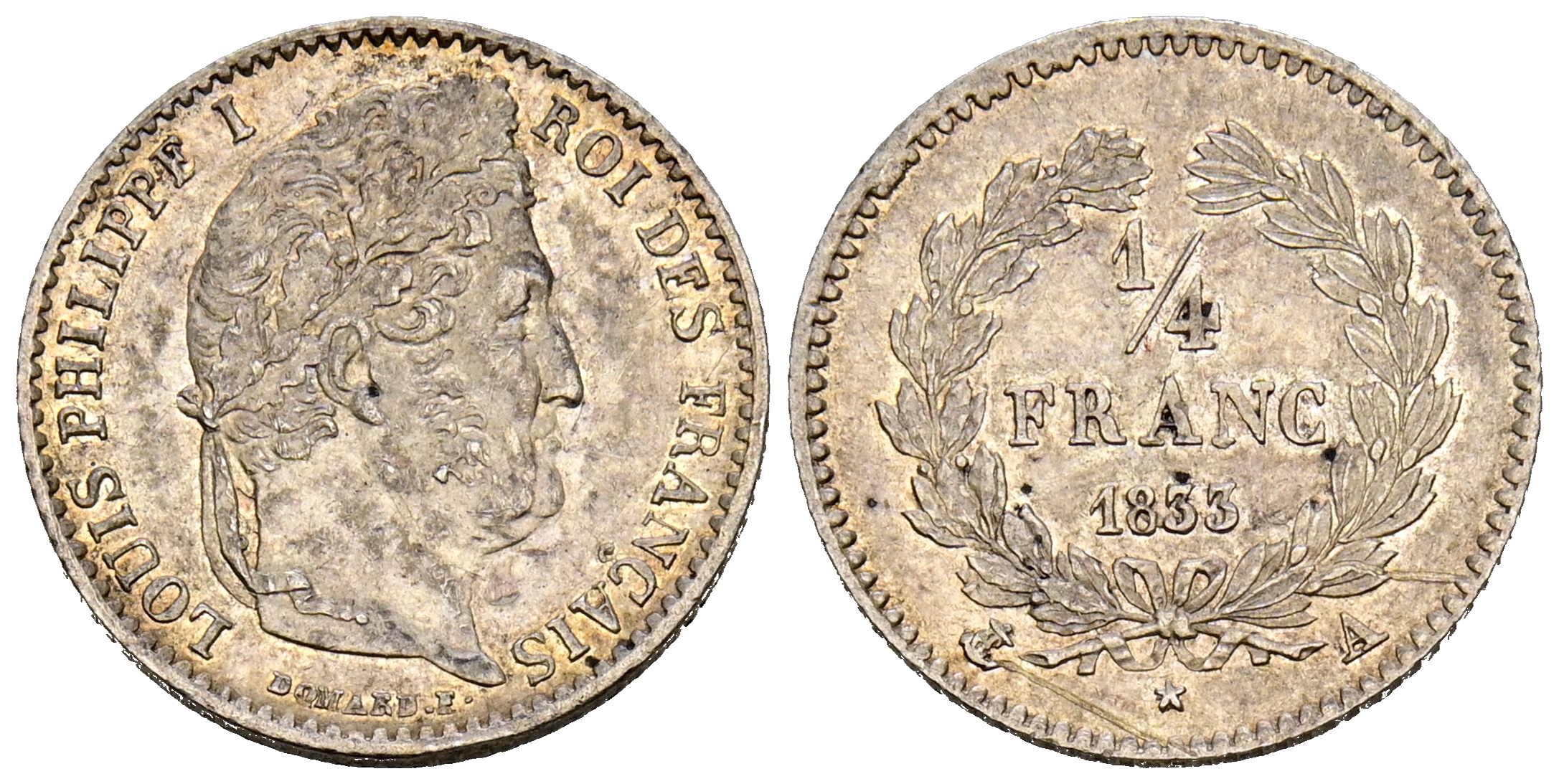 FRANCE, Louis Philippe I. 1/4 Franc. (Ar. 1.25g/15mm). 1833. Paris A. (Km#740). EF/EF-. Small scratch on reverse. Traces of original luster.