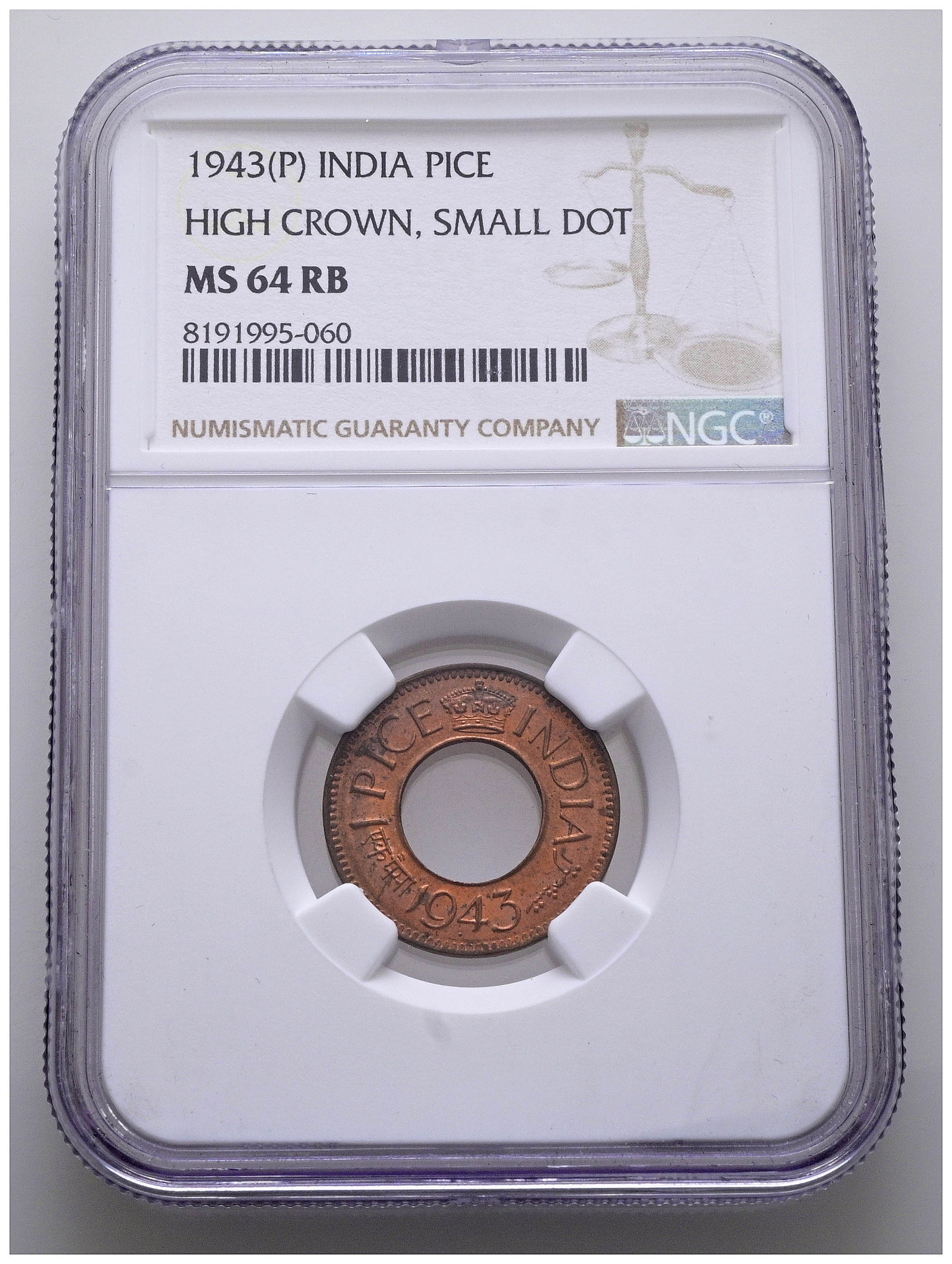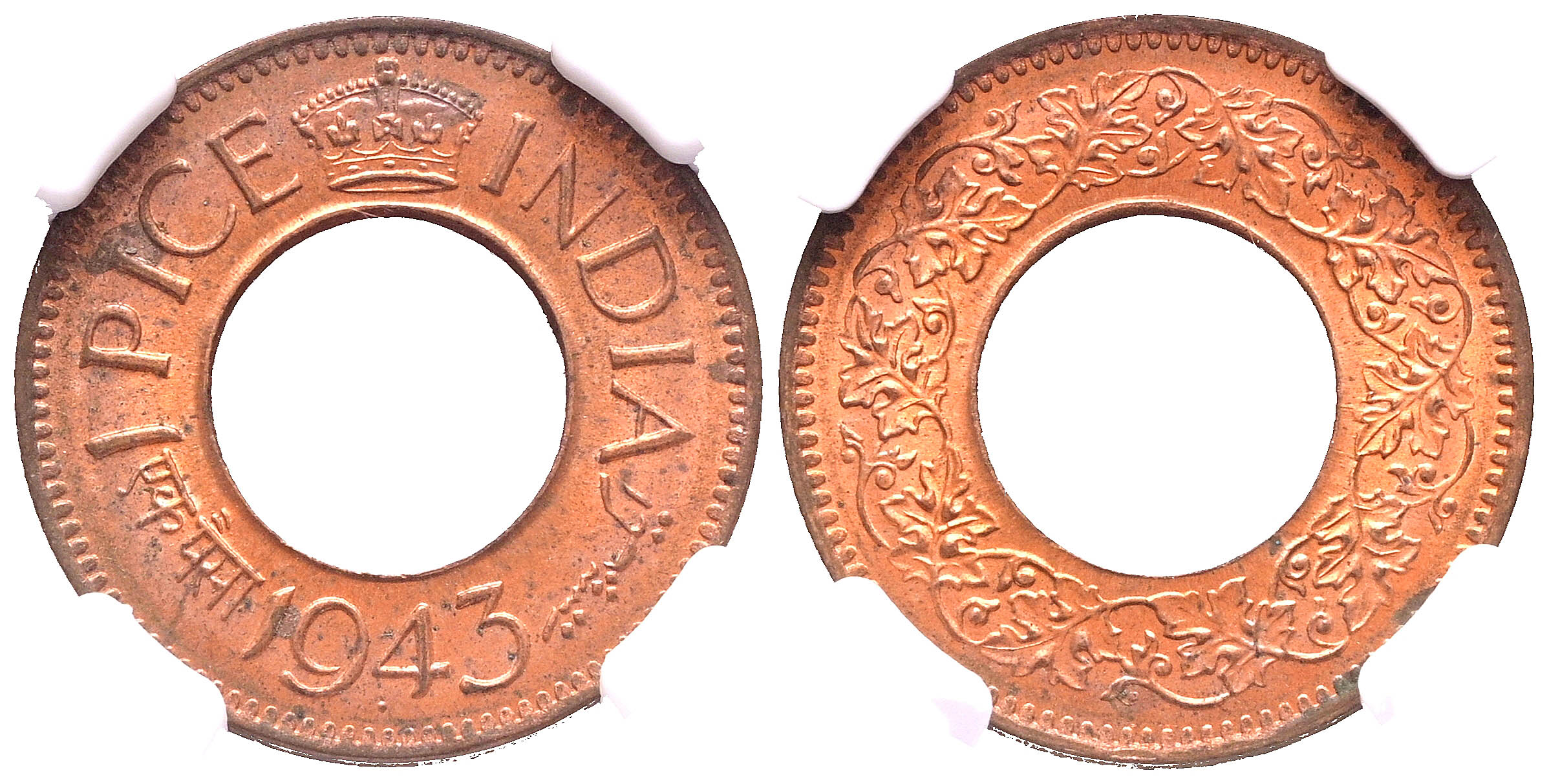 INDIA (British), George VI. 1 Paise. (Ae. 2.00g/21mm)*. 1943. Pretoria. (Km#533). Encapsulated by NGC MS 64 RB. *Theoretical weight and dimensions.