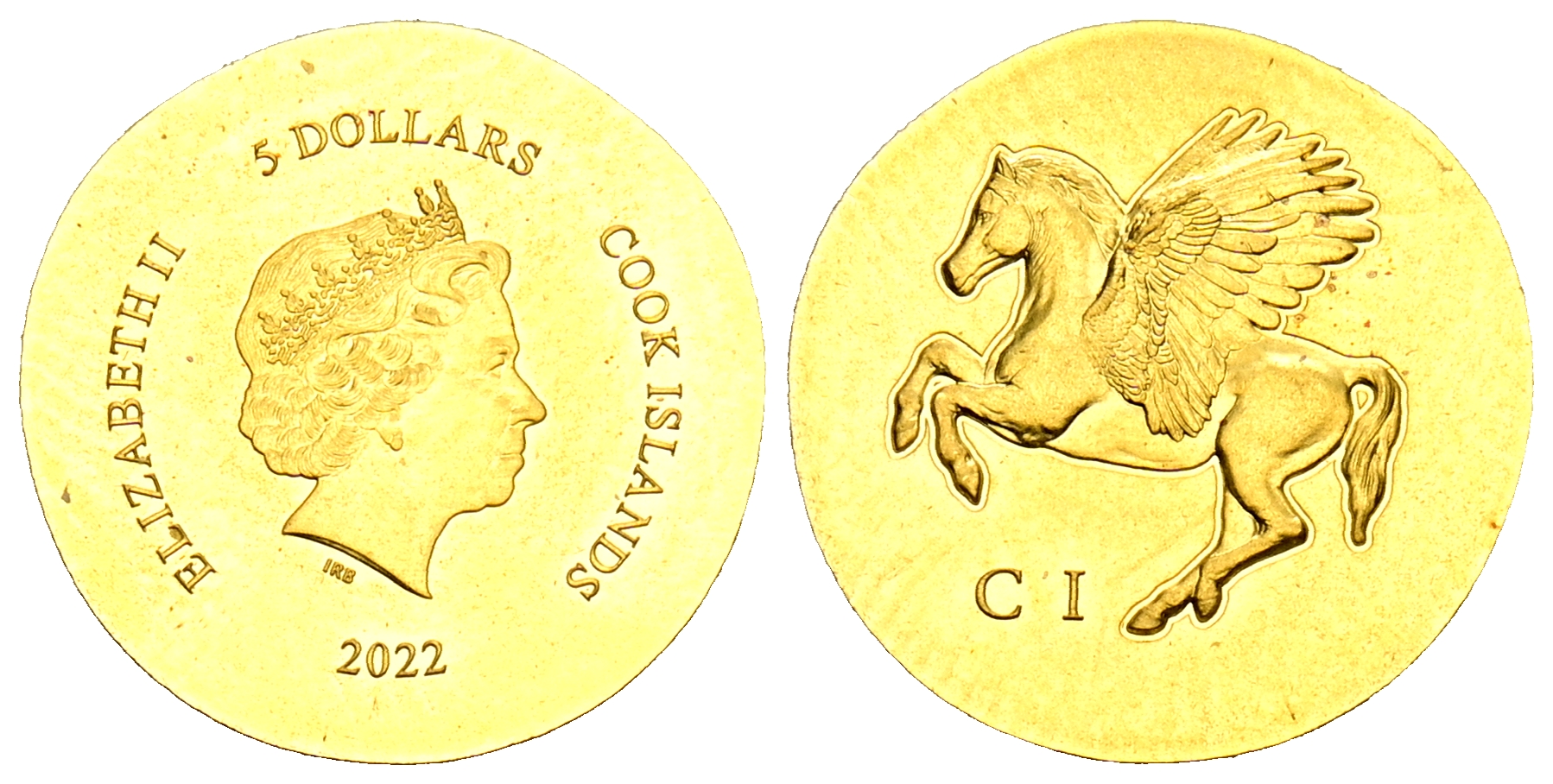 English COOK ISLANDS, Elizabeth II. 5 Dollars. (Au. 0.50g/12mm). 2022. Pegasus. 0.999 fine gold. Scarce.
