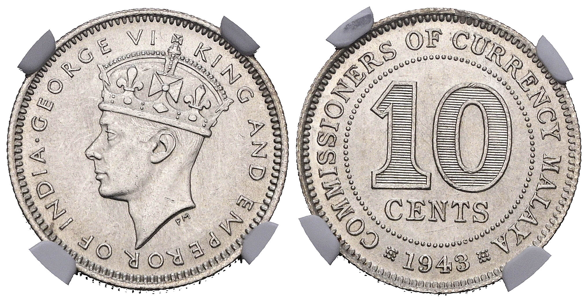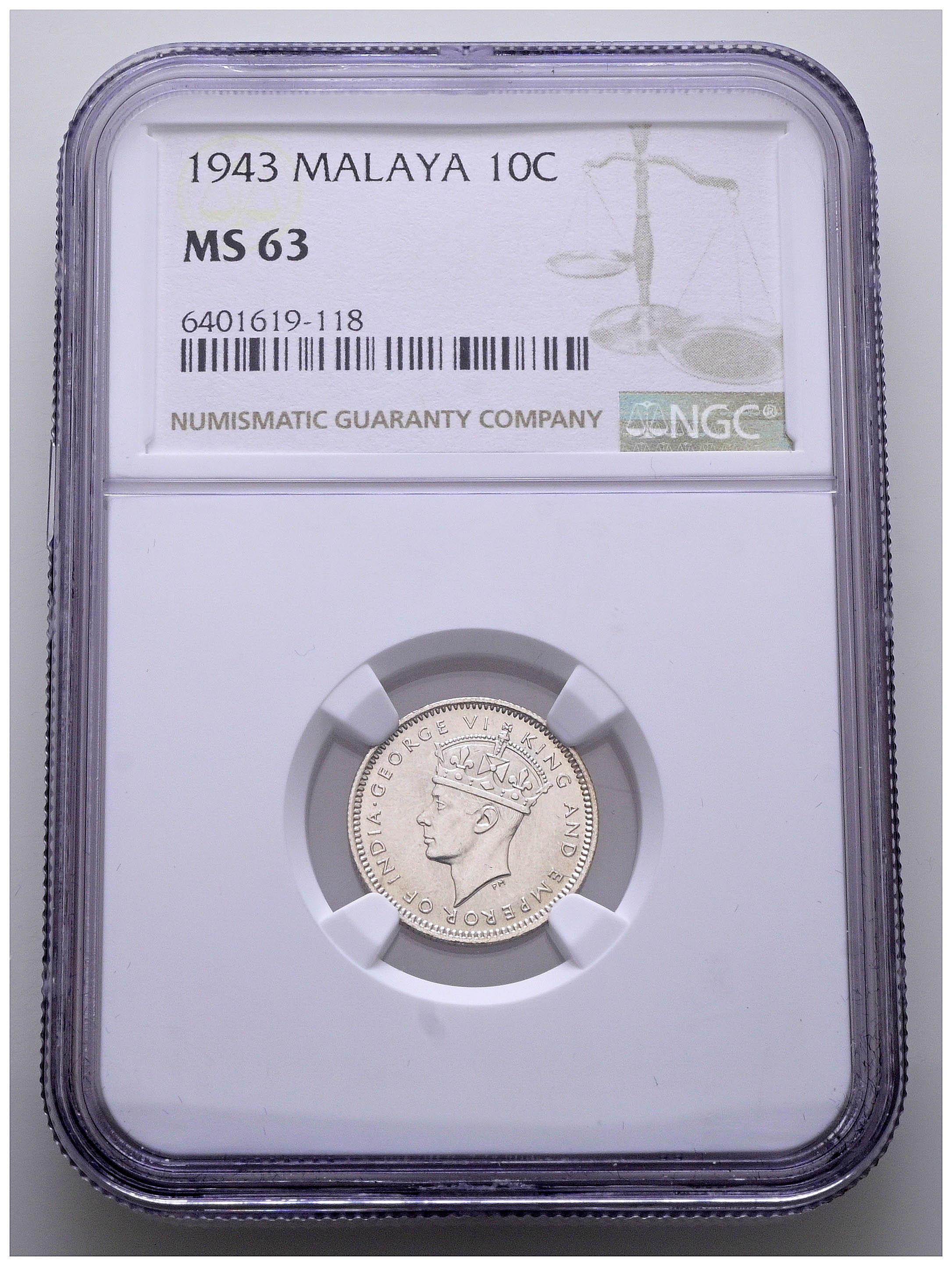 MALAYA, George VI. 10 Cents. (Ar. 2.71g/18mm)*. 1943. (Km#4a). Encapsulated by NGC MS 63. *Theoretical weight and dimensions.