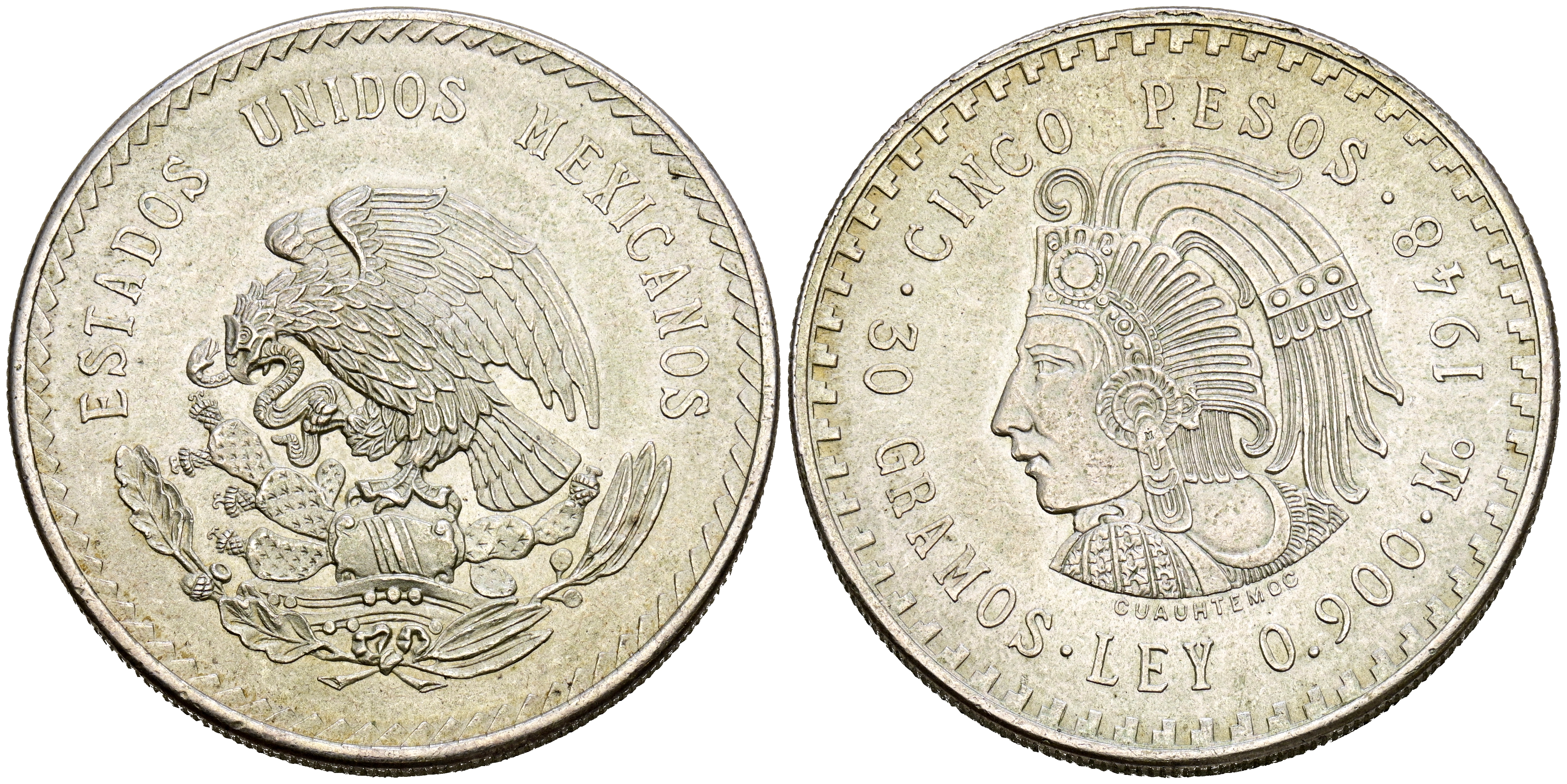 English MEXICO. 5 Pesos. (Ar. 30.11g/40mm). 1948. (Km#465). Extremely Fine.