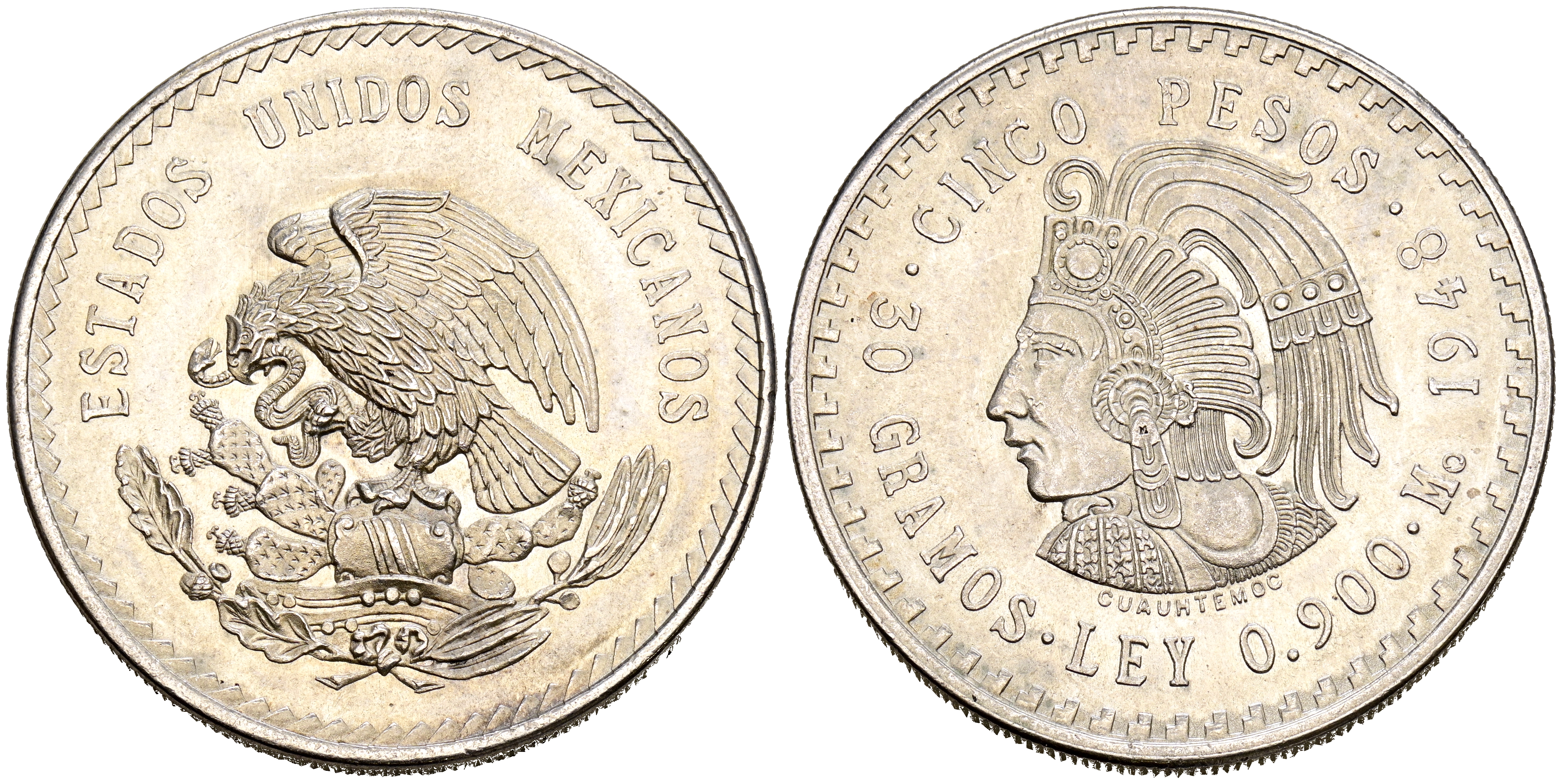 English MEXICO. 5 Pesos. (Ar. 29.87g/40mm). 1948. (Km#465). Uncirculated-.