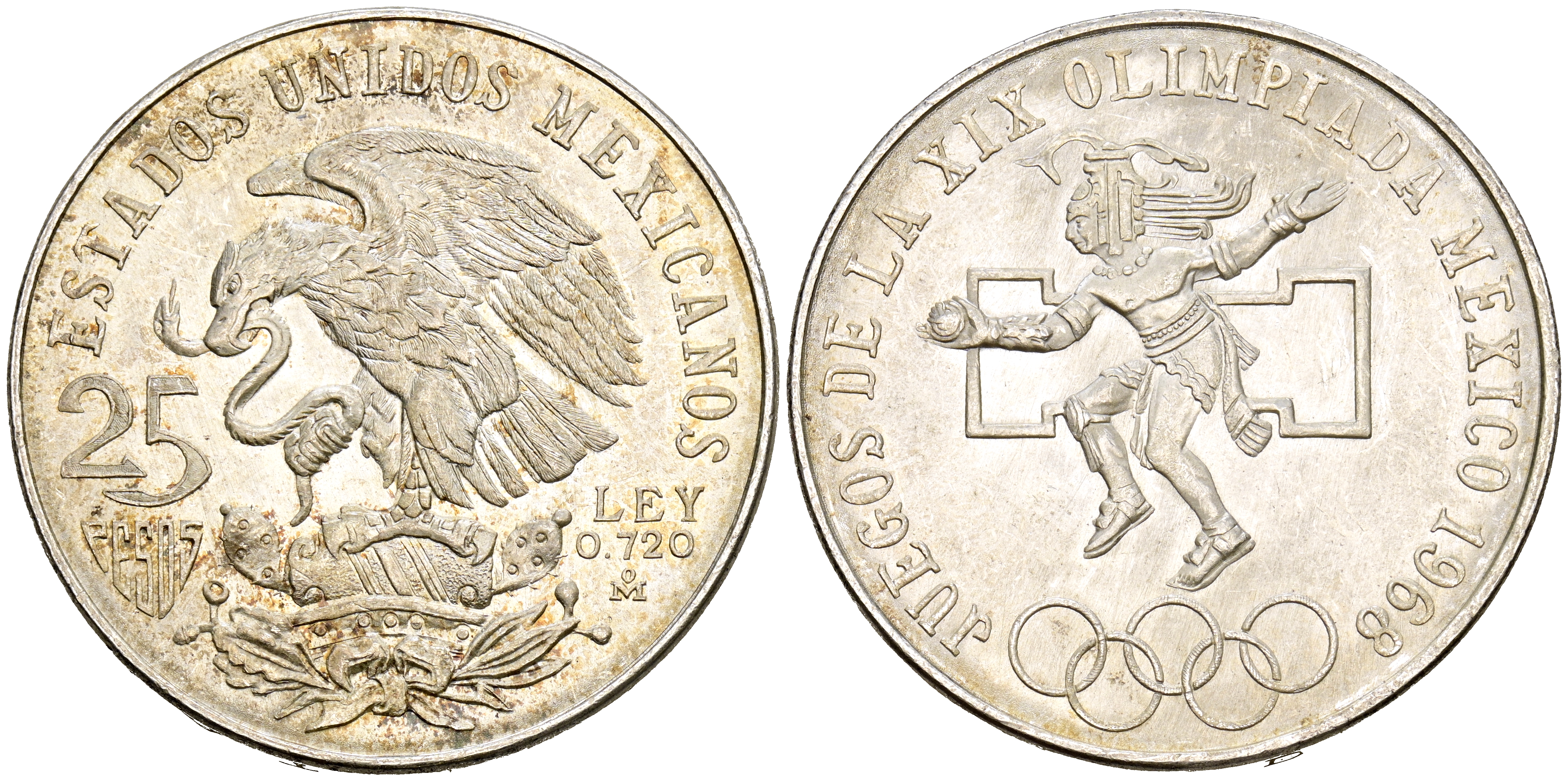 MEXICO. 25 Pesos. (Ar. 22.64g/38mm). 1968. Mexico City Olympic Games 68. (Km#468). EF+.