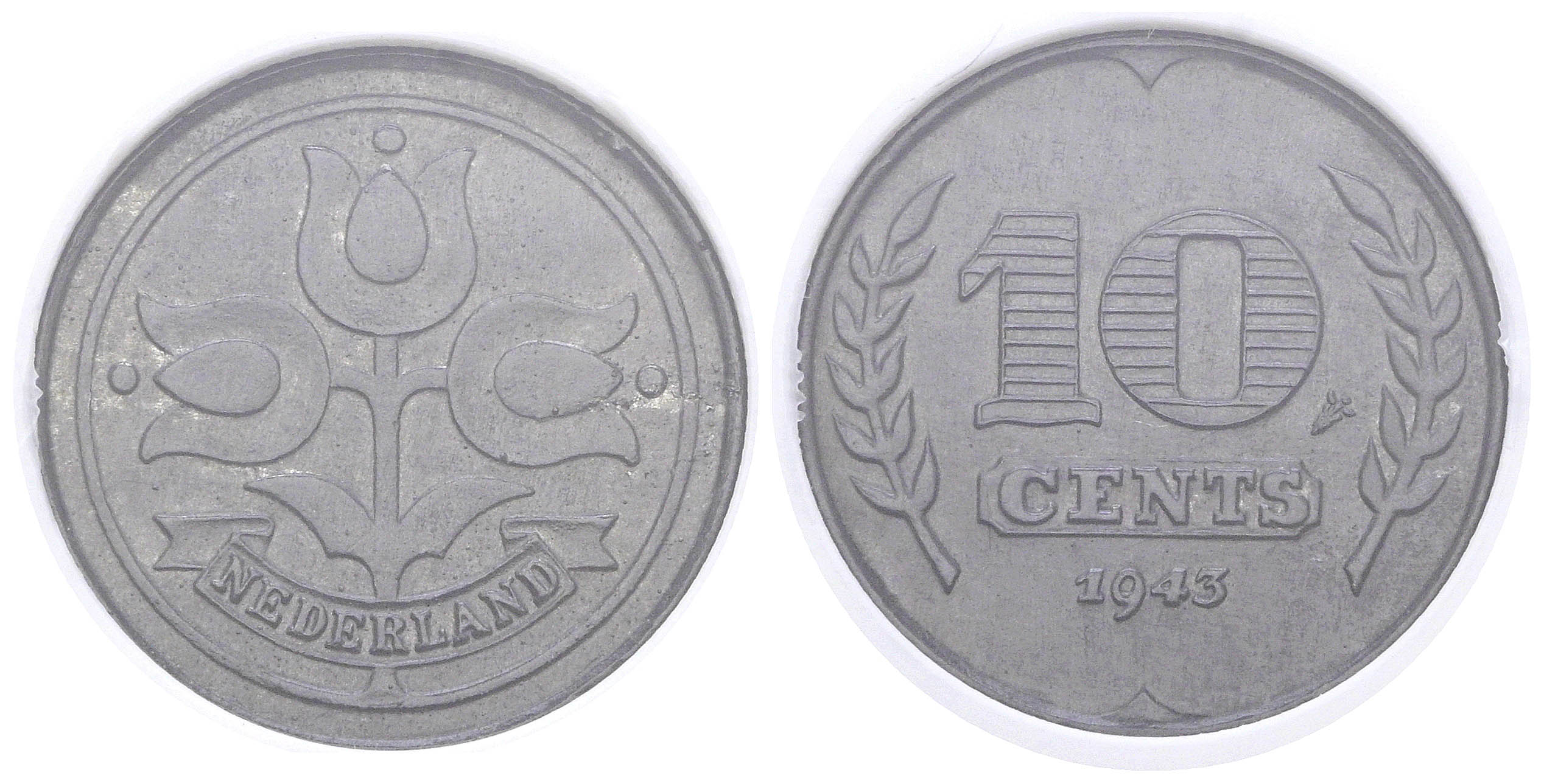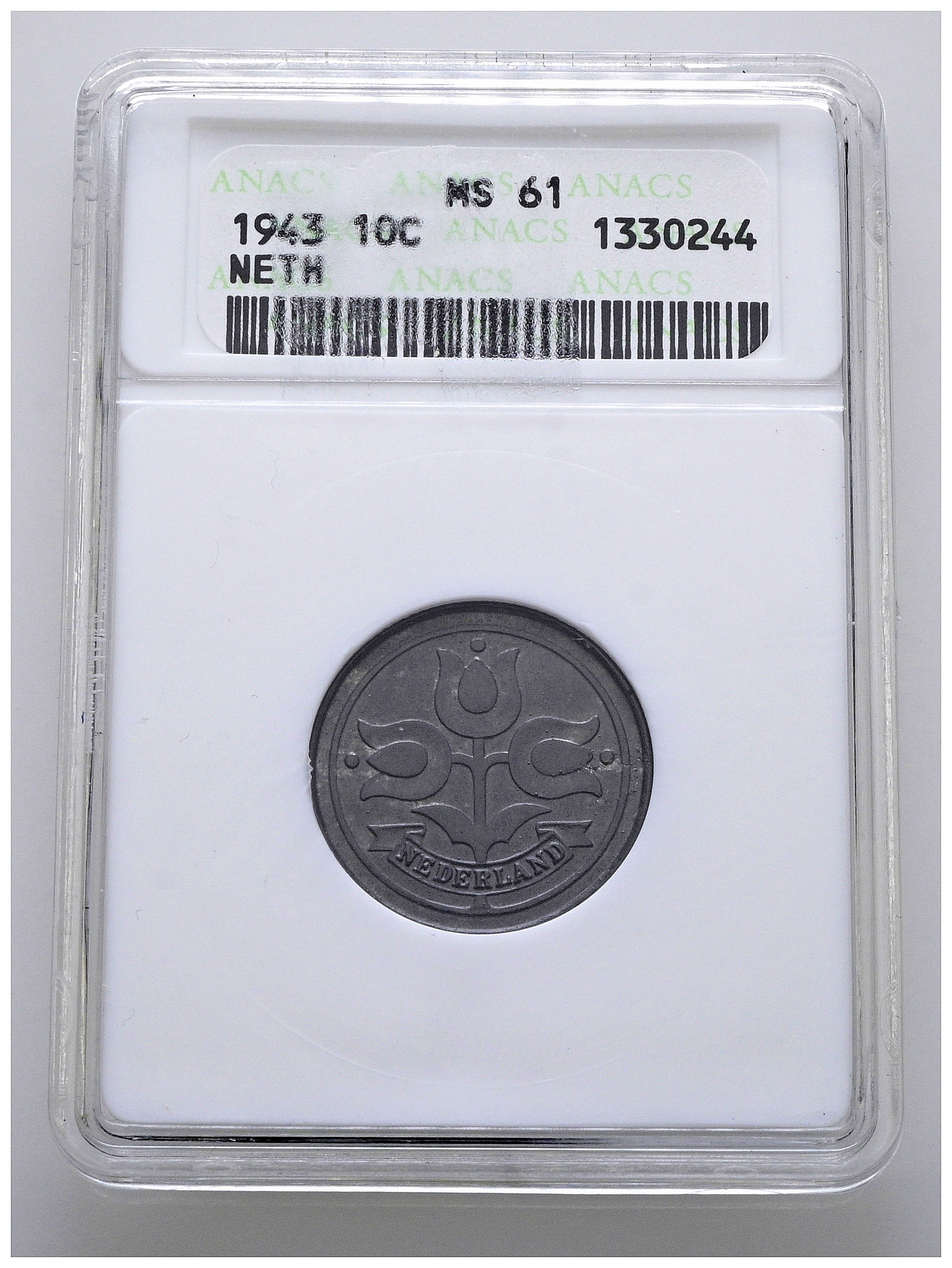 English NETHERLANDS. 10 Cents. (Zn. 3.30g/22mm)*. 1943. German occupation. (Km#173). Encapsulated by ANACS MS61. *Theoretical weight and dimensions.