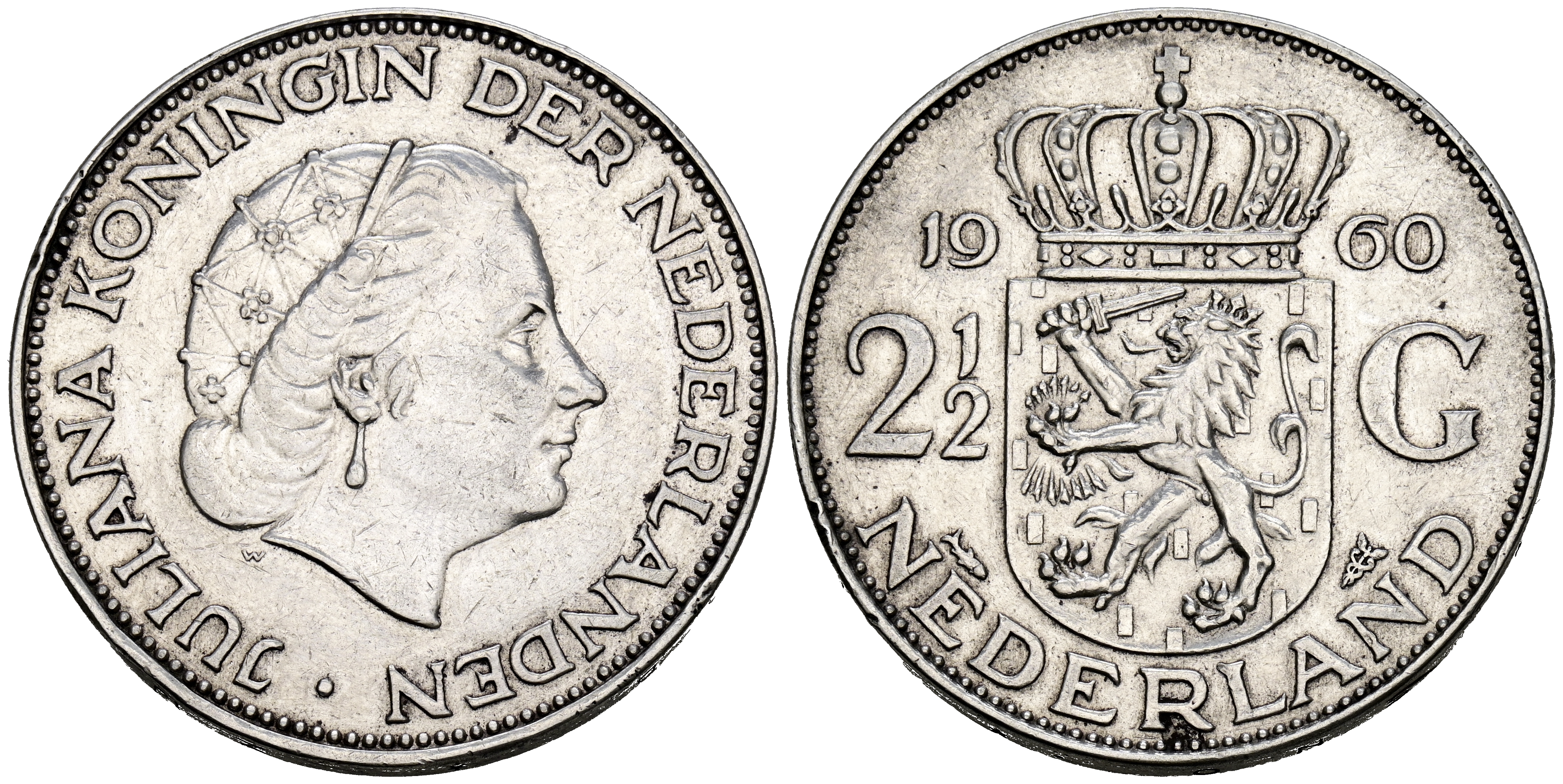 NETHERLANDS, Queen Juliana. 2 1/2 Gulden. (Ar. 14.96g/33mm). 1960. (Km#185). Good Very Fine.